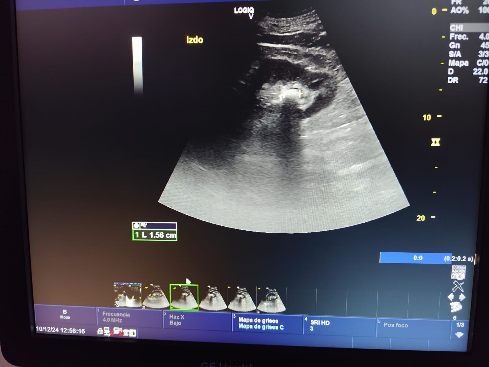 Ecografía en atención primaria (POCUS): Ecografía del riñón izquierdo: Litiasis de 1.4 cm en polo inferior, morfología y tamaño normales. Resto sin alteraciones.