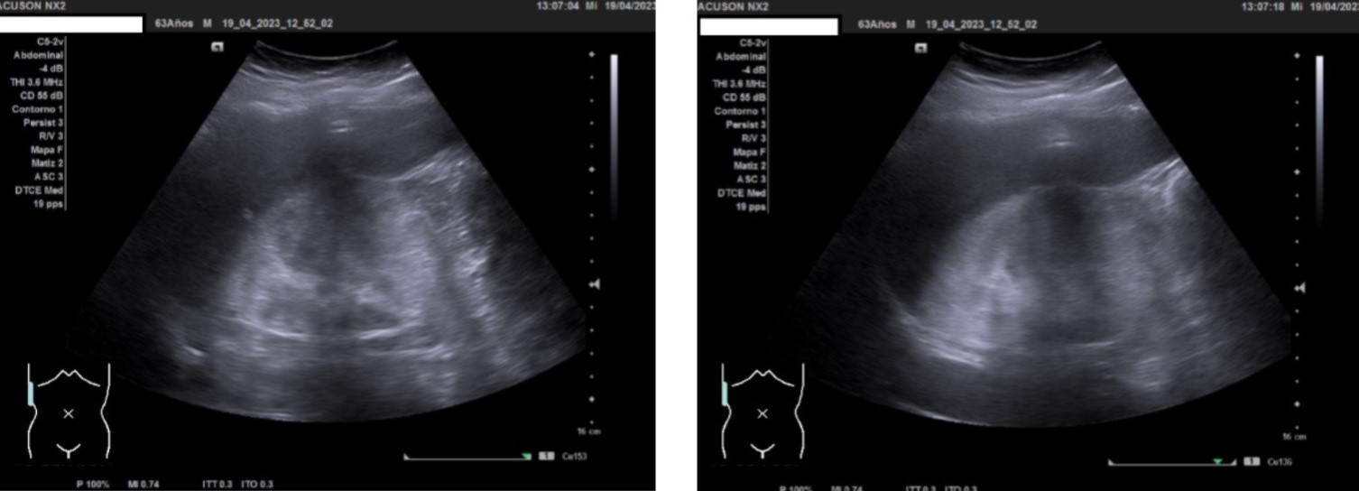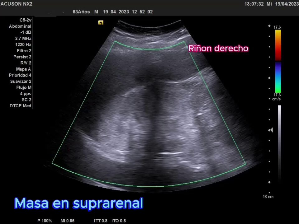 Ecografía clínica urológica: se observa imagen hiperecogénica a nivel de polo superior de riñón derecho que no capta al Doppler color y que mide 10 cm.