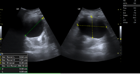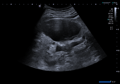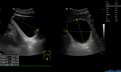 - Ecografía clínica renovesical: Vejiga sin lesiones ocupantes de espacio, sin residuo postmiccional, próstata de tamaño aumentado (56 cc). Ambos riñones con quistes corticales simples, de hasta 9,6 cm en el riñón izquierdo. Sistema excretor derecho no dilatado. Leve-moderada dilatación pielocalicial izquierda. No se evidencian imágenes ecográficas sugestivas de litiasis en pelvis renal.