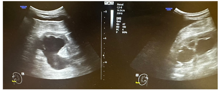 Ecografía clínica: Ureterohidronefrosis grado III bilateral con ectasia ureteral bilateral en toda su extensión. Probable proceso neoformativo urinario con dimensiones aproximadas de 5,61 x 2,74 cm.