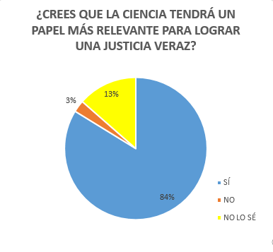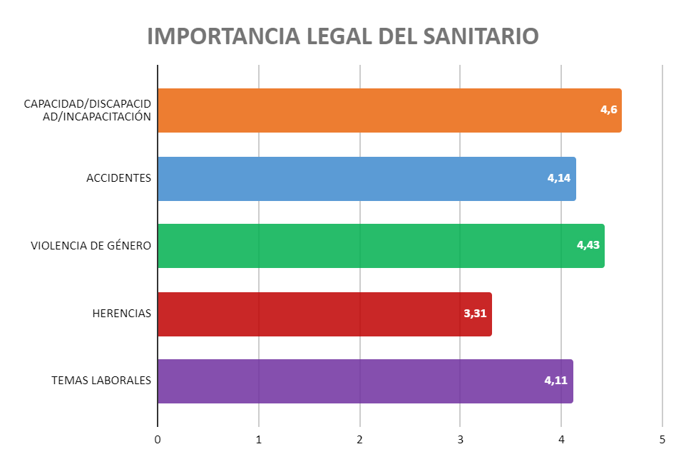 Con asistencia de 50 personas, 57% pacientes entre los asistentes, tasa de respuesta 74%. Se evaluó la importancia del sanitario en temas legales, máxima puntuación 5. Los encuestados señalaron 4,11 en temas laborales, herencias 3,31, violencia de género 4,43, accidentes 4,14 y discapacidad/incapacitación 4,6. El 84% de los participantes pensaron que el valor de la ciencia en la justicia será más importante en el futuro.