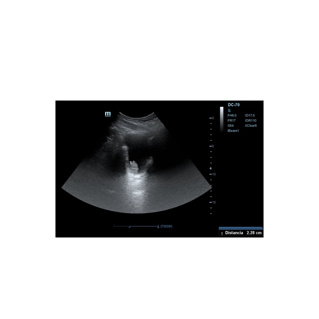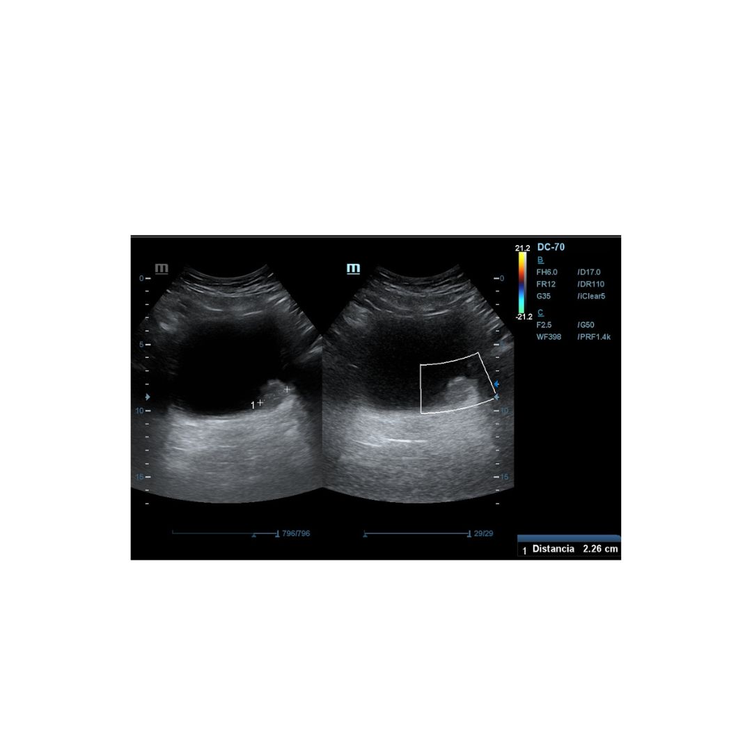 Es derivado a consulta de ecografía de nuestro centro de salud, donde realizamos Ecografía clinica abdominal, apreciándose imagen hiperecogénica pediculada en pared posterior izquierda de la vejiga vejiga, fija, que mide 2,26 mm aproximadamente en su eje mayor, sin captación Doppler.