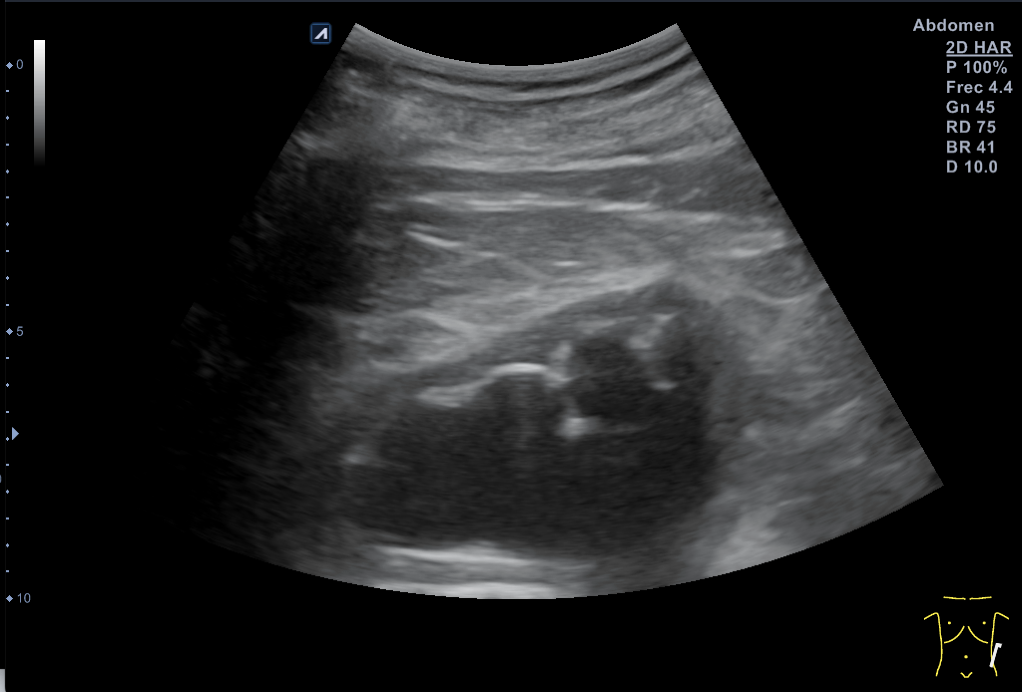 Tras valoración vesicoprostática con vejiga normal, jet vesicales visibles con próstata de 45 cc y residuo postmiccional mínimo. Riñón derecho como normal de tamaño y morfología sin dilataciones pielocaliciales (11 cm de tamaño). El Riñón Izquierdo (RI: 9 cm) presentaba una hidronefrosis grado IV y atrofia cortical con pelvis renal distendida, no consiguiendo detectar la causa obstructiva y considerando la posibilidad de una estenosis de la unión pieloureteral y como segunda opción una litiasis ureteral pese a la normalidad de los jets vesicales.