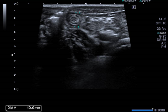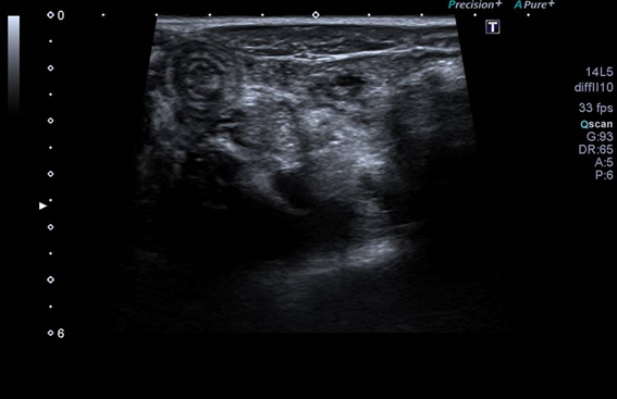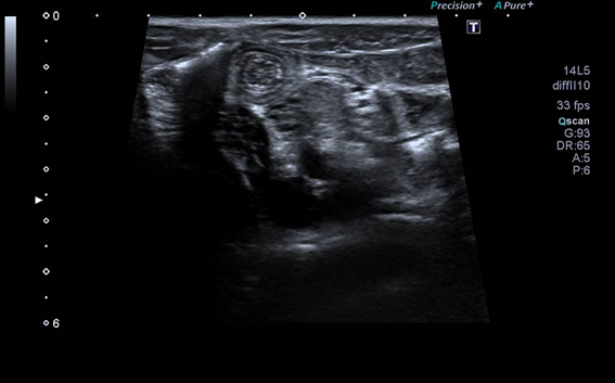Ante signos de peritonismo, se realiza analítica sanguínea y ecografía abdominal para descartar apendicitis aguda. Se evidencia ligera elevación de reactantes de fase aguda (sin leucocitos ni neutrofilia con PCR 2.3 mg/dL).