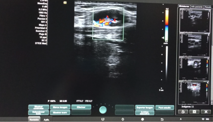 A las dos semanas de iniciar el tratamiento con ibuprofeno, se realiza el control ecográfico que evidencia ganglios cervicales bilaterales, inespecíficos de probable carácter reactivo y menores de 10 mm en el eje corto, por lo que finalmente se decide no exéresis de adenopatía.
