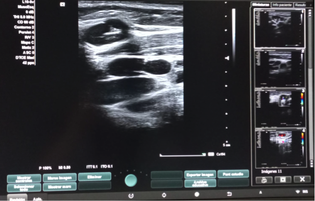 Dos adenopatías en territorio laterocervical derecho, con hilio central y doppler positivo, alguna con diámetro transversal superior al longitudinal, de probable origen reactivo y una adenopatía supraclavicular sin hilio central y con vascularización generalizada.