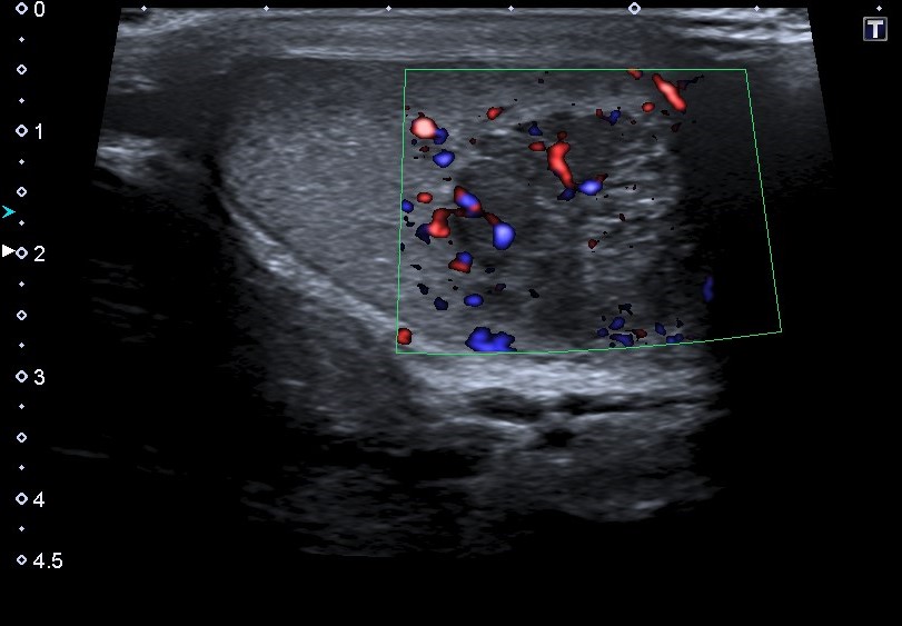 Dados los hallazgos sugestivos de malignidad en ecografía clínica escrotal, nos ponemos en contacto con el servicio de radiología de nuestro hospital de referencia para realizar una ecografía reglada de manera muy preferente (menos de una semana) que confirma proceso neoformativo testicular.