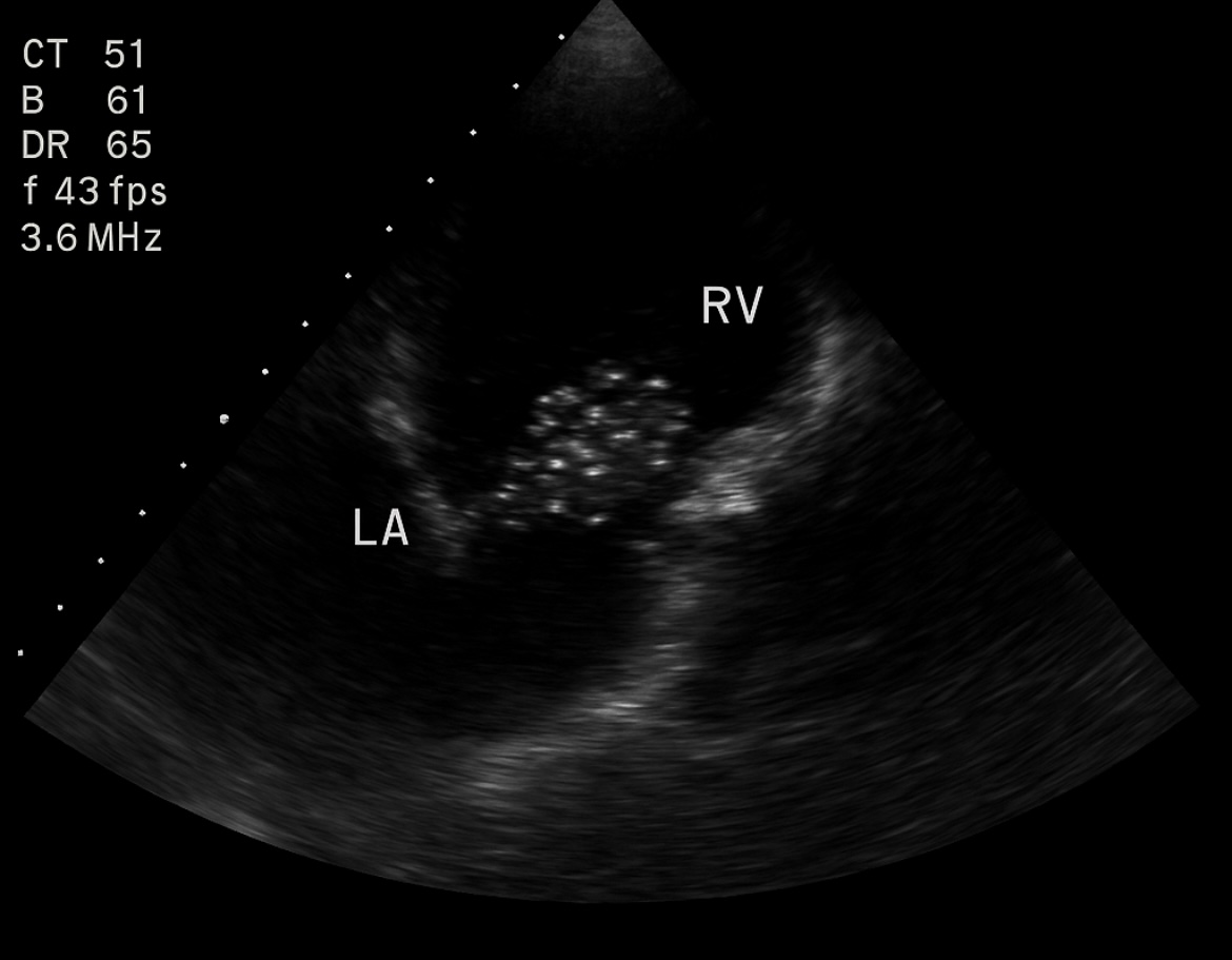 Hallazgos: VD discretamente dilatado. AD y tracto de entrada VD con múltiples microburbujas hiperecogénicas, moviéndose en flujo turbulento. No derrame pericárdico. Vena cava inferior colapsable.