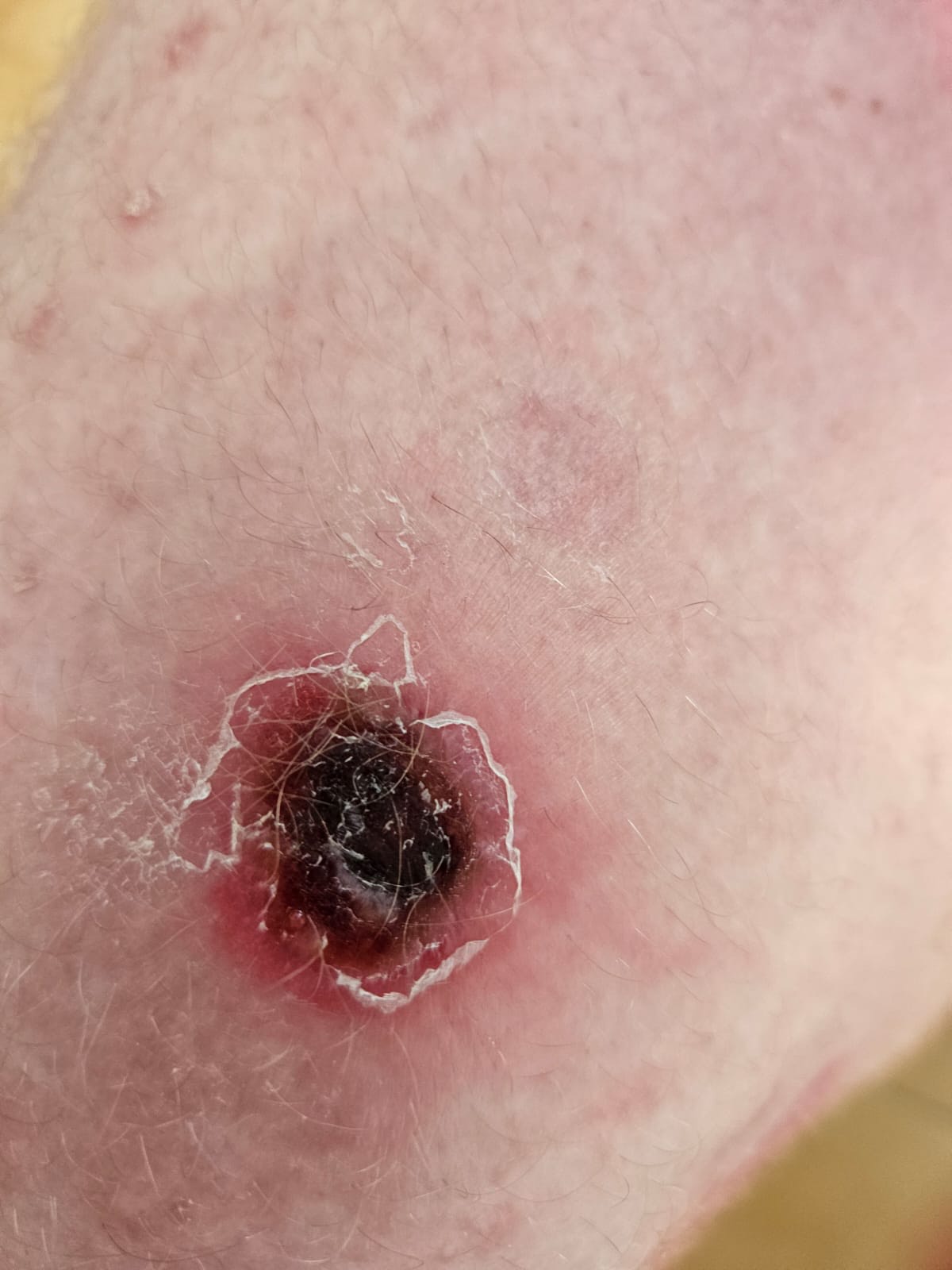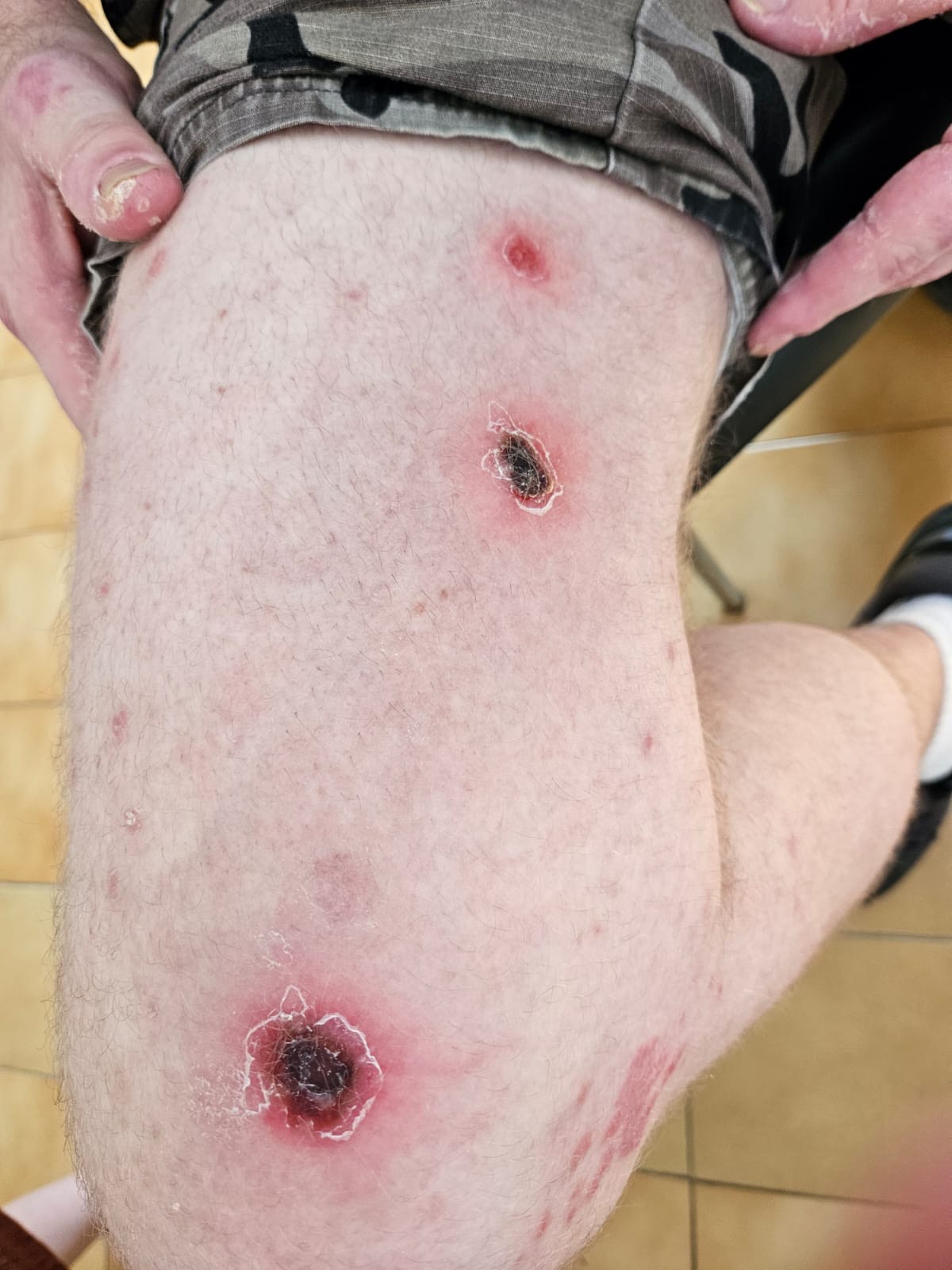 Anamnesis: Hombre de 55 años consulta por lesiones cutáneas, mal estar general y fiebre 38 ºC de una semana de evolución. Refiere que las lesiones aparecen el primer día de fiebre siendo placas anulares con exudado purulento y centro necrótico en extremidades y cara. Niega otros síntomas. Refiere inicio de tratamiento con sulfasalazina hace 1 mes. Tiene gatos y gallinas. Refiere picadura de garrapata hace años. Niega viajes al extranjero. No toma leche no pasteurizada. Niega ingesta de alimentos embotados. Niega relaciones sexuales.