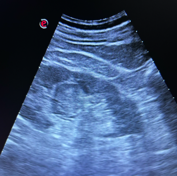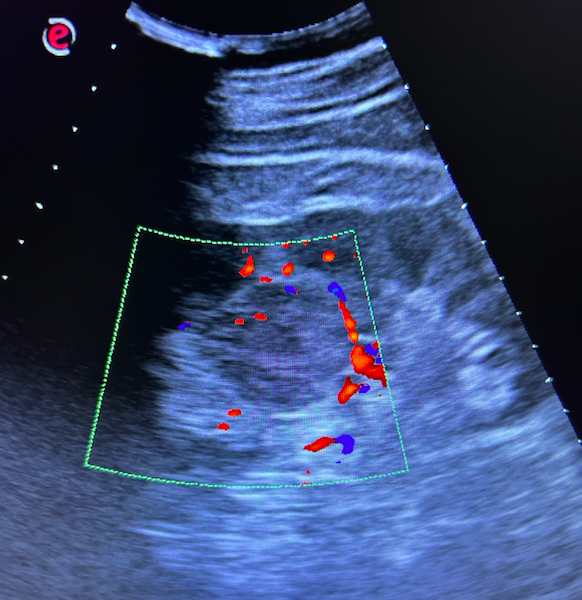 Riñones sin datos de hidronefrosis o litiasis pero en riñón izdo se visualiza lesión levemente hipoecogénica respecto a médula renal, de bordes bien definidos con doppler positivo en periferia.