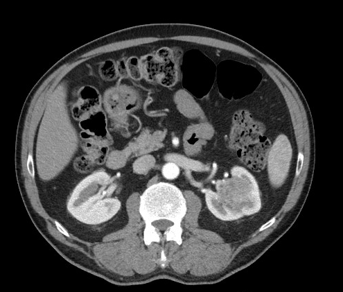 Hombre de 55 años con AP DM, DLP, en tto con oxicodona por hernias discales lumbares. AF de padre con carcinoma renal. Refiere dolor lumbar izquierdo de 5 días de evolución, irradiado a ingle, de tipo cólico que empeora en decúbito. Inicialmente disuria ya resuelta sin hematuria. Afebril.