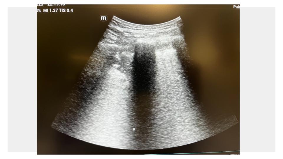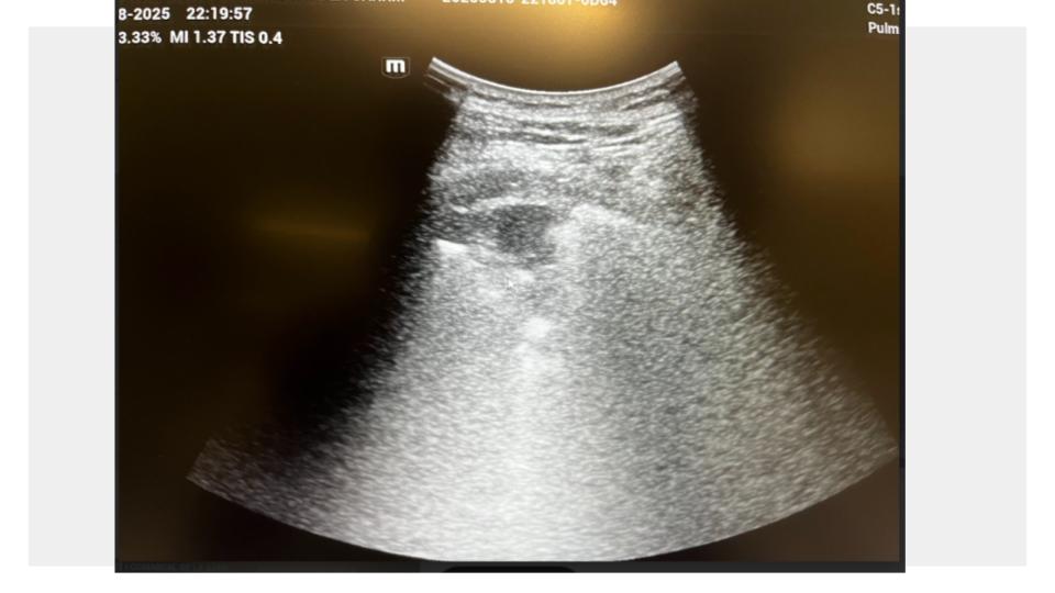 Se realiza ecografía pulmonar a pie de cama, donde se objetiva: consolidación subpleural en lóbulo inferior derecho, compatible con neumonía.