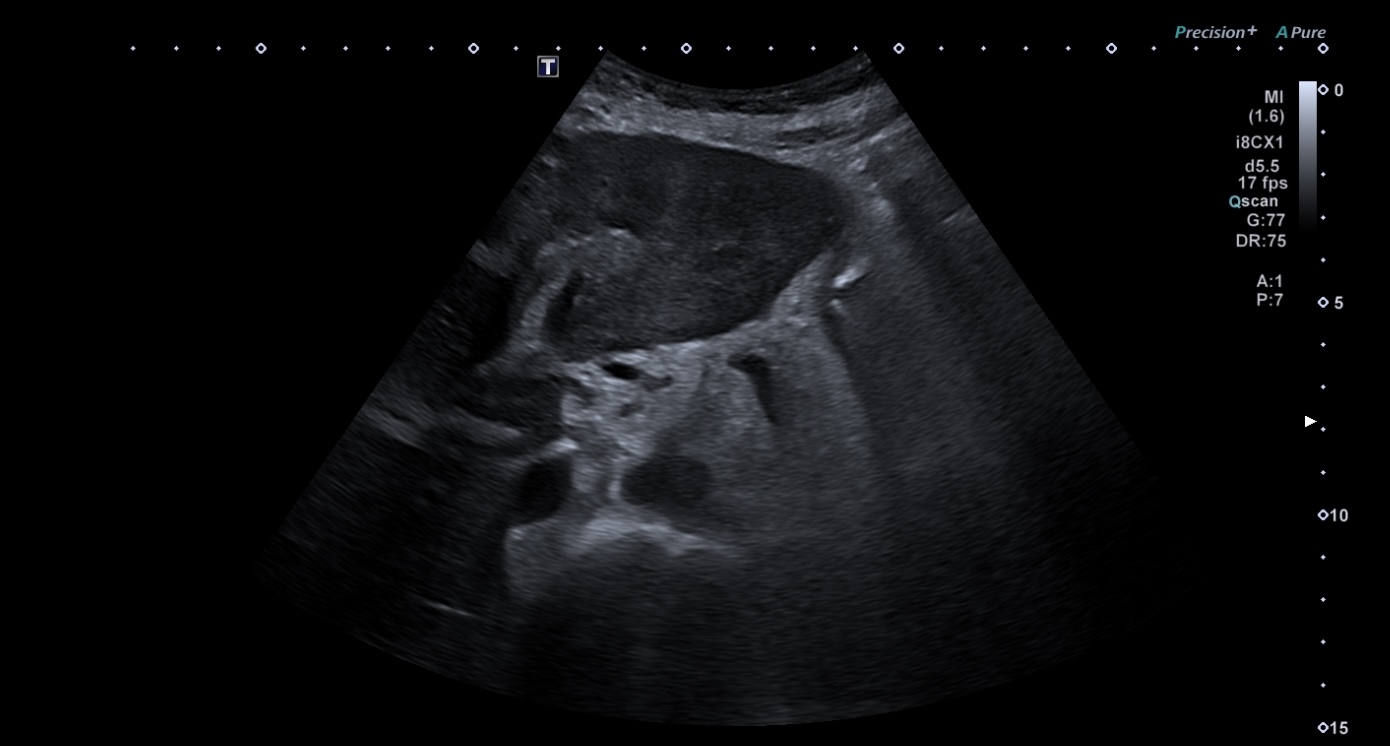 Ecografía abdominal en AP: se observan múltiples LOES hepáticas sugestivas de metástasis.