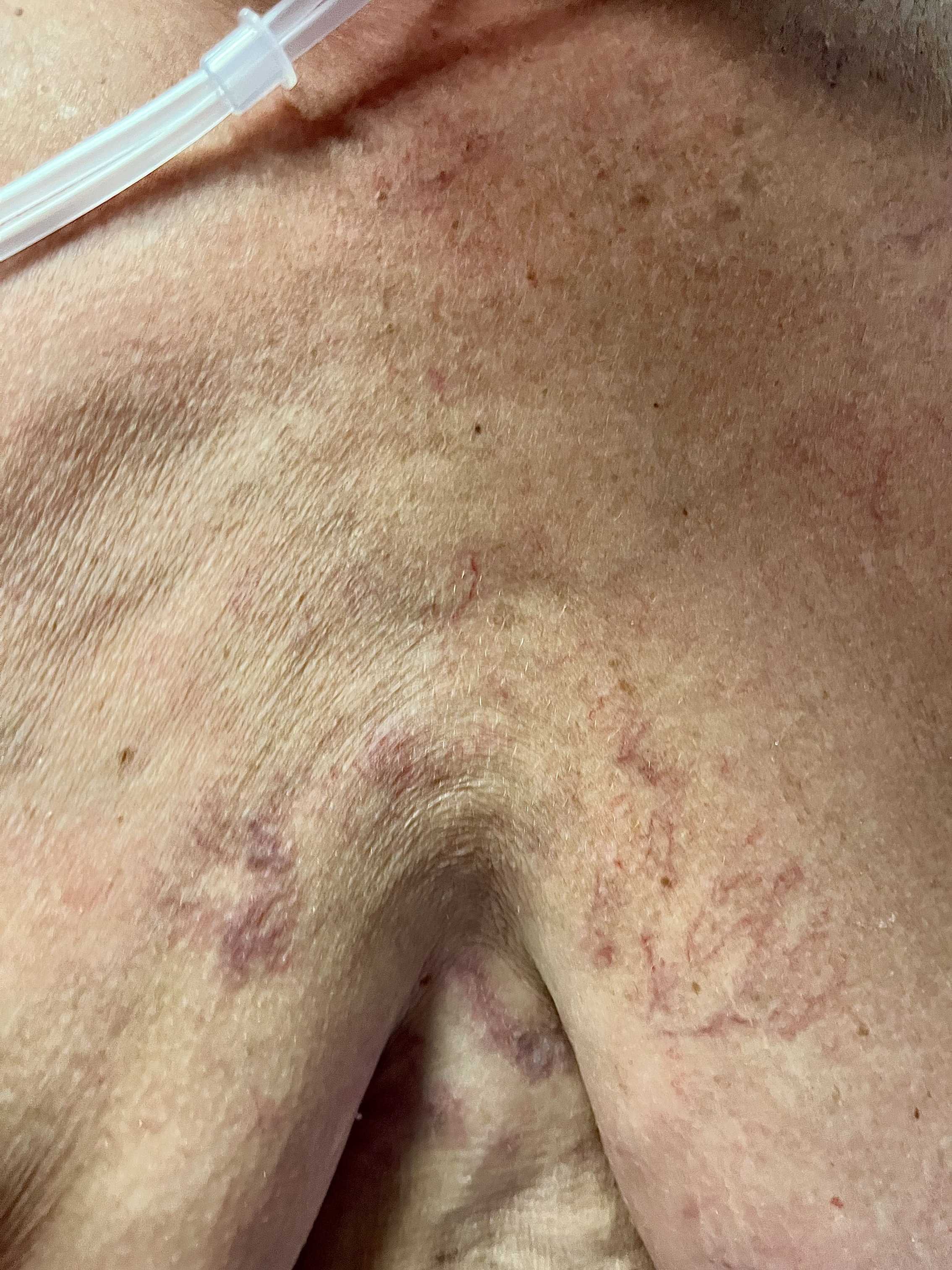 A la exploración física se encontraba hipotensa, normocárdica, afebril y con taquipnea superficial. Destacaba edema y eritema de ambas mamas, sin nódulos, adenopatías axilares o secreción en pezones. Asimismo, presentaba eritema de hemitórax superior con telangiectasias, edema cervical y de miembro superior izquierdo. Auscultación cardiopulmonar sin hallazgos y extremidades inferiores sin signos de trombosis.