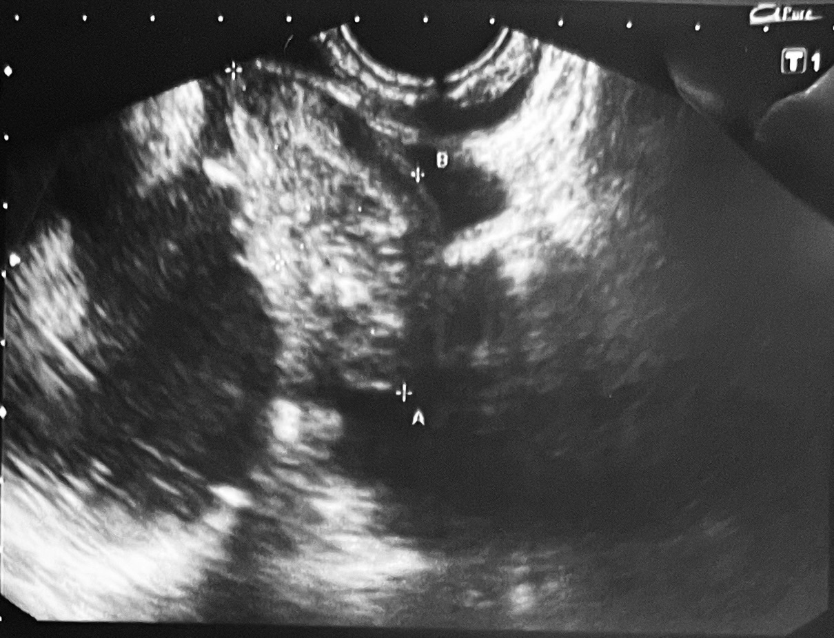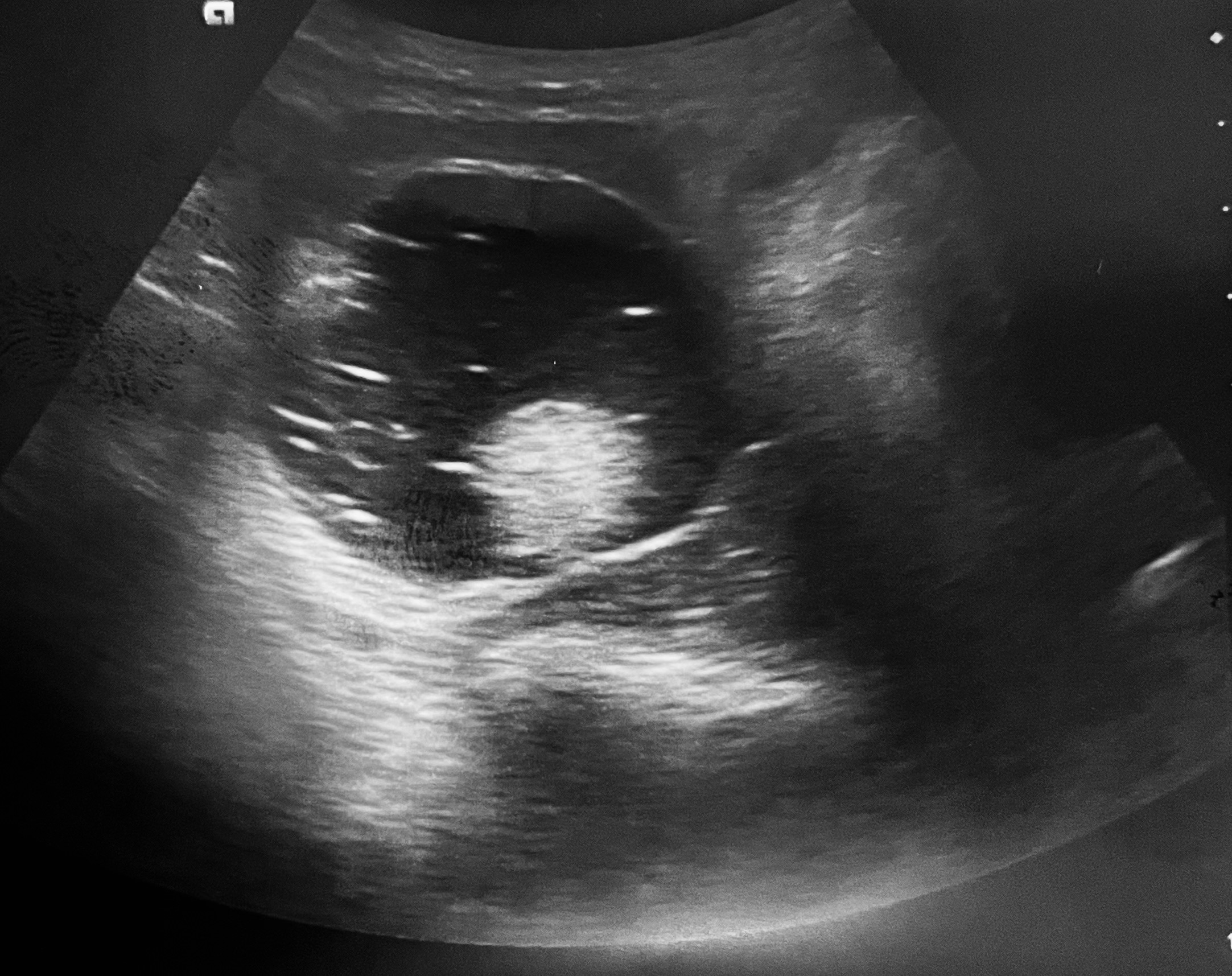 La ecografía clínica abdominal identificó una masa anexial heterogénea con áreas hiperecogénicas y refringentes, además de moderado líquido libre pélvico, hallazgos compatibles con lesión compleja de probable origen teratomatoso.