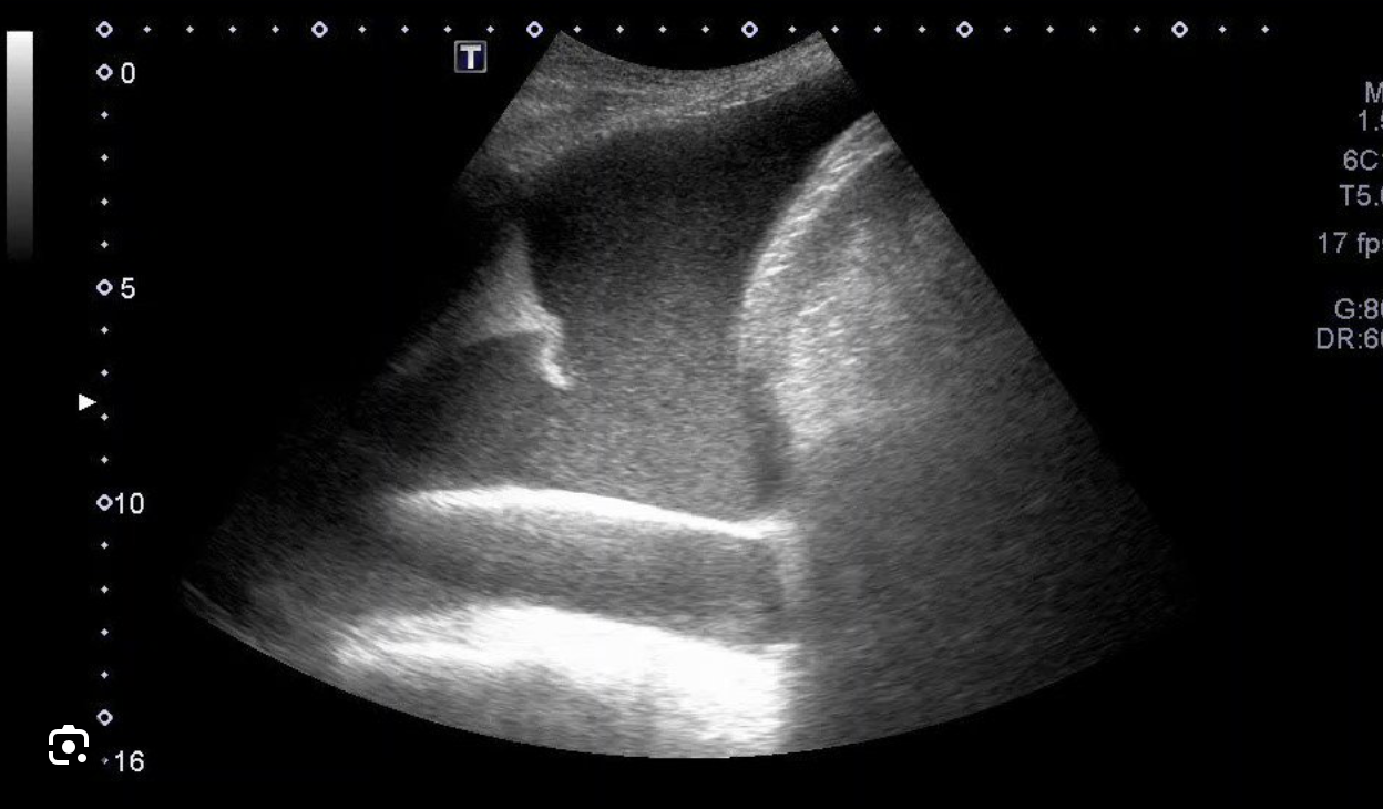 Ecografía pulmonar: mínimo derrame pleural izquierdo sin derrame pericárdico asociado. Sí se detecta derrame pleural derecho, observándose el «signo de la medusa» que se corresponde con una atelectasia completa del lóbulo pulmonar inferior, que flota sobre un derrame pleural masivo.