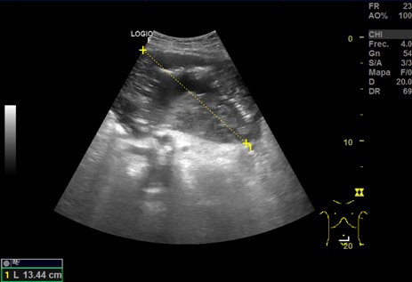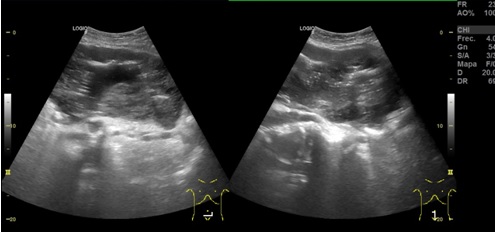 Hallazgos ecográficos: en región umbilical se aprecia una neoformación de contenido heterogéneo de unos 15 cm de diámetro. Imágenes compatibles con Esteatosis hepática. Quistes renales derechos. Esplenomegali.