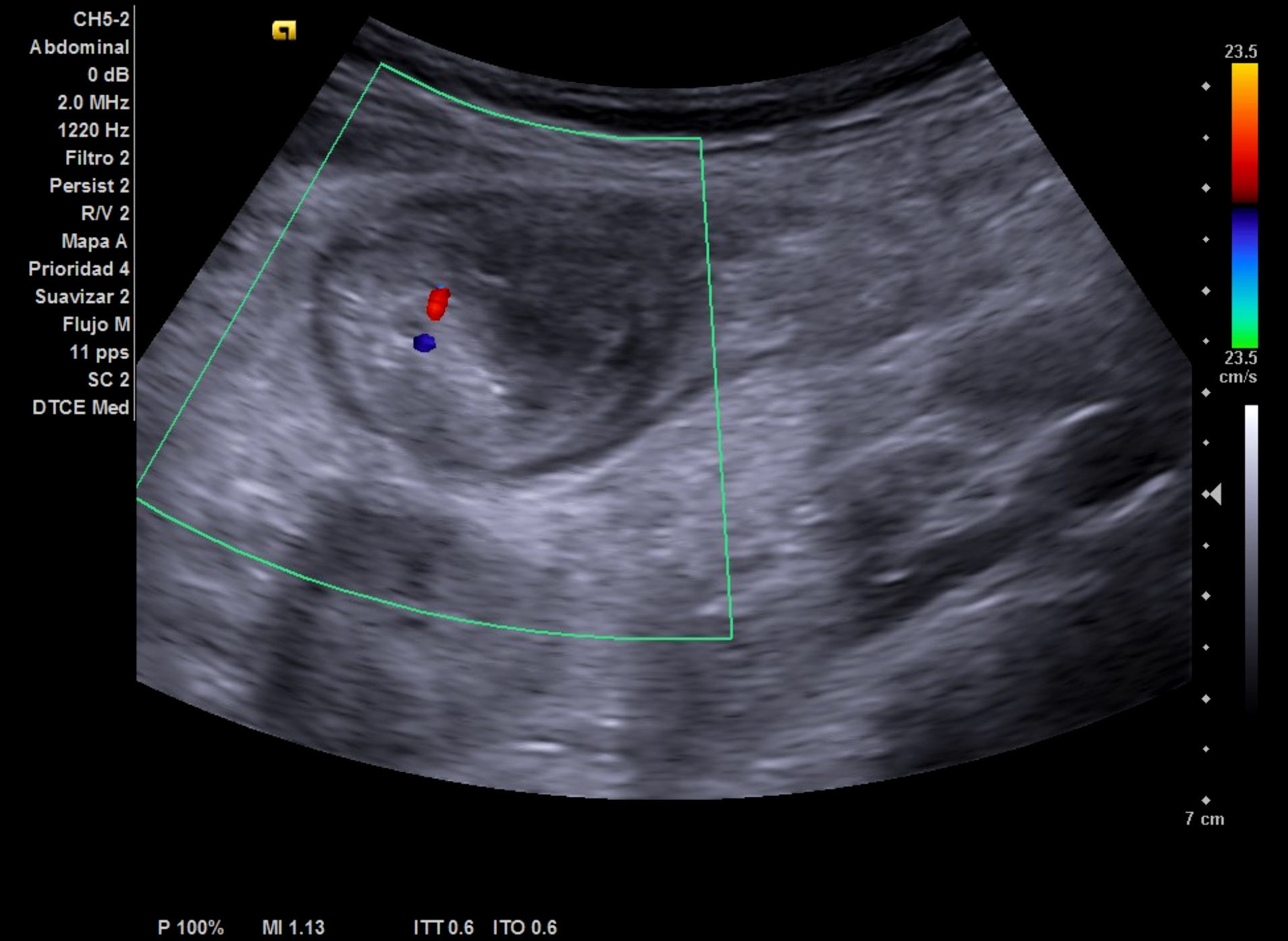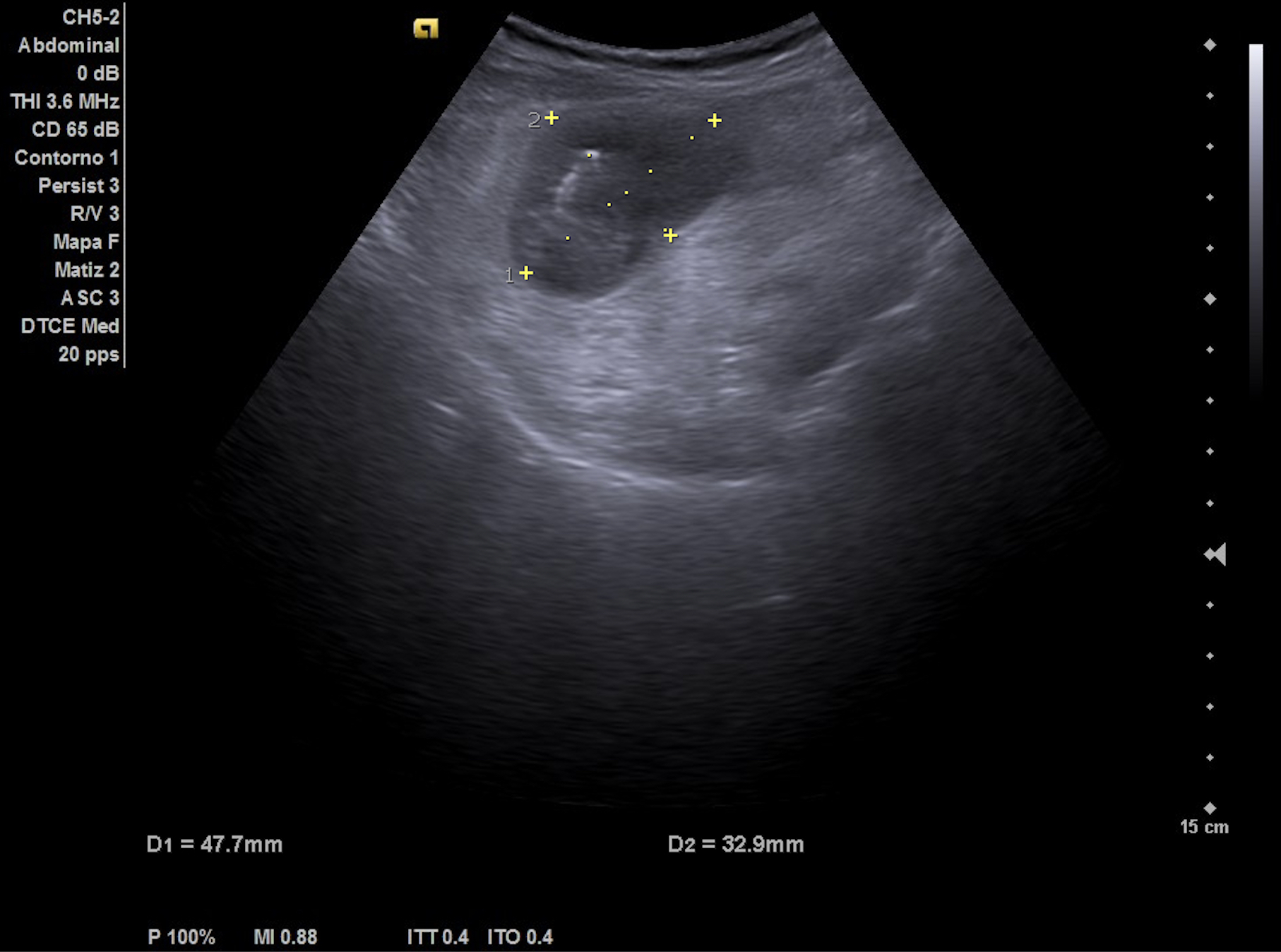 - Hígado de tamaño y eco-estructura normal. Riñón derecho normal. Imagen localizada anterior a riñón derecho, redondeada-ovalada, hipoecoica con zonas hiperecoicas en su interior, vascularizada probablemente compatible con signo de pseudo-riñón con sospecha de neoplasia de colon.