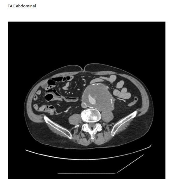 TAC abdominopevico: Aneurisma aorta abdominal (AAA) infrarrenal. Se observan signos de inestabilidad/rotura inminente, diámetro de 10 cm.