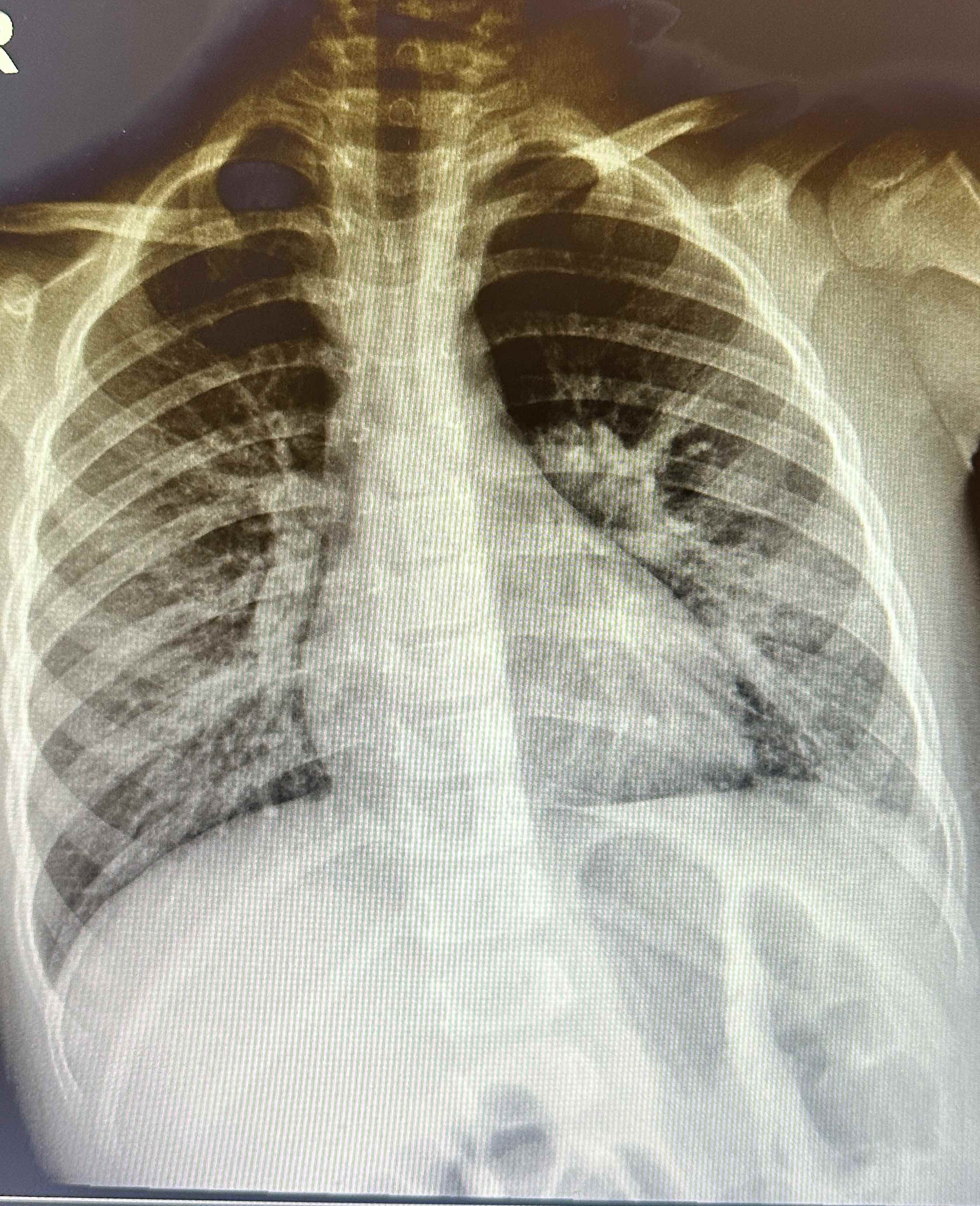 Lactante de 2 años sin antecedentes médicos o quirúrgicos conocidos, con esquema de vacunación completa, refieren los padres 3 días de presentar fiebre de hasta 39 ºC, continua y tos. Al Examen físico con buen estado general, llanto fácil pero consolable, activo y reactivo. Tórax: no tirajes costales, a la auscultación pulmonar con subcrepitante en base pulmonar izquierda e hipoventalación en zona lateroexterna basal izquierda. Se solicita radiografía de tórax en la que hay dudas sobre posible infiltrado basal por lo que se realiza ecografía pulmonar en la que se evidencian líneas B y pequeño derrame pleural.