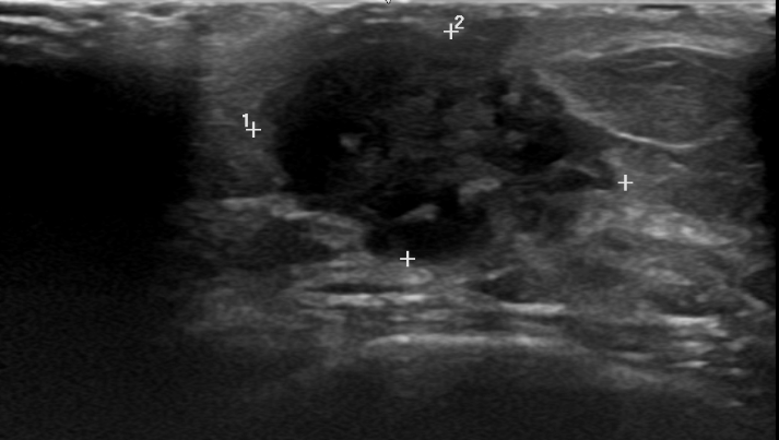 Se realiza una ecografía en centro de salud sobre lesión próxima a pezón de consistencia dura de más de dos dedos de grosor, donde se observa una imagen heterogénea (áreas isoecogénicas y áreas hipoecogénicas) sin captación de flujo de 20 mm o mayor, no aspecto ovoide sino masa circular. En axila próxima se observa ganglio ovalado con centro hiperecogénico sin captación de flujo que descarta adenopatía sospechosa de malignidad.Pruebas complementarias