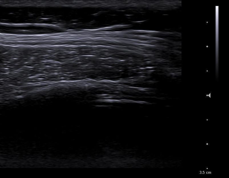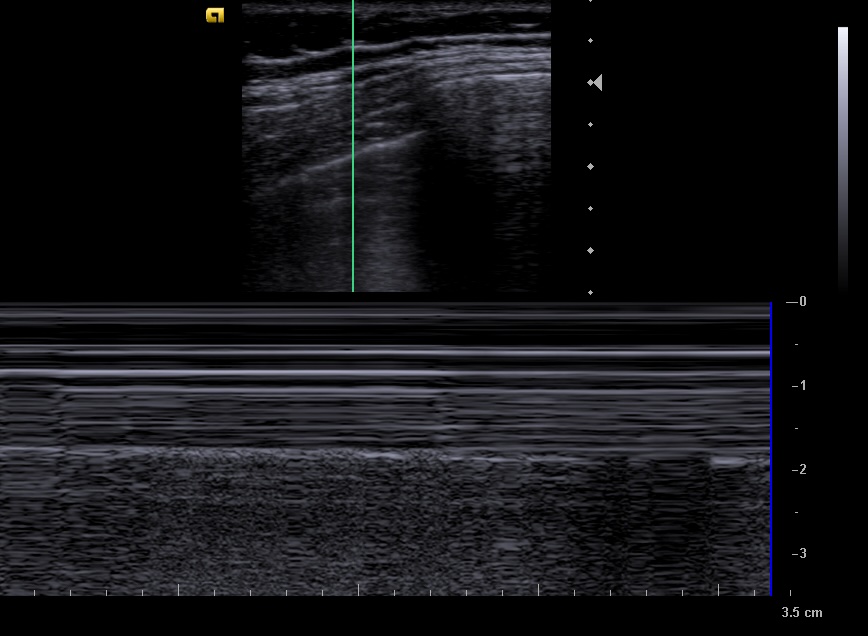 En la ecografía apreciamos en campo derecho un patrón ecográfico tisular, con líneas y puntos hiperecoicos, y algún artefacto en cola de cometa, correspondientes a broncograma aéreo.