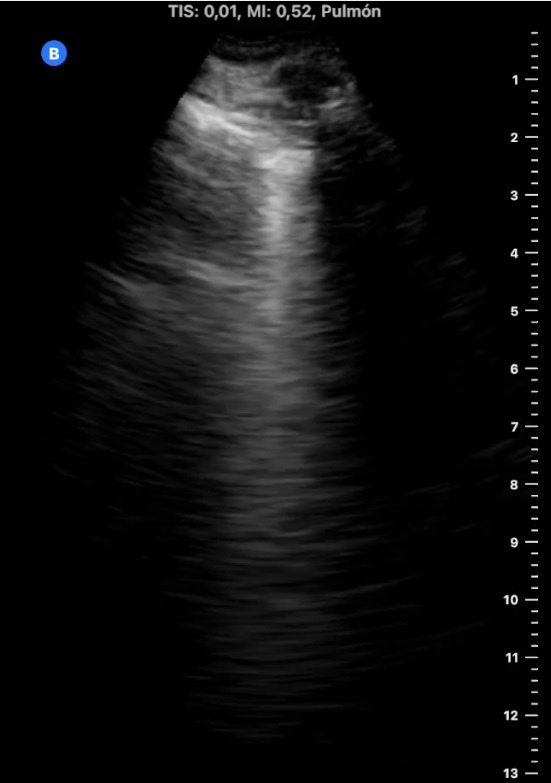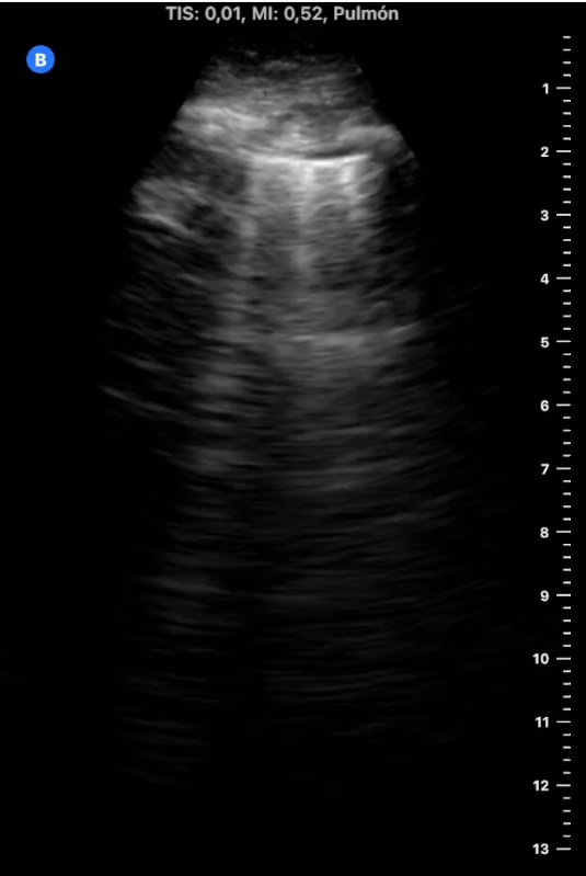 Ecografía pulmonar en AP:«Líneas B en campos pulmonares izquierdos y consolidación pulmonar en base derecha con mínimo derrame pleural, compatible consolidación infecciosa vs tromboembólica.