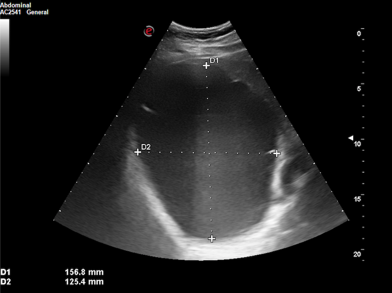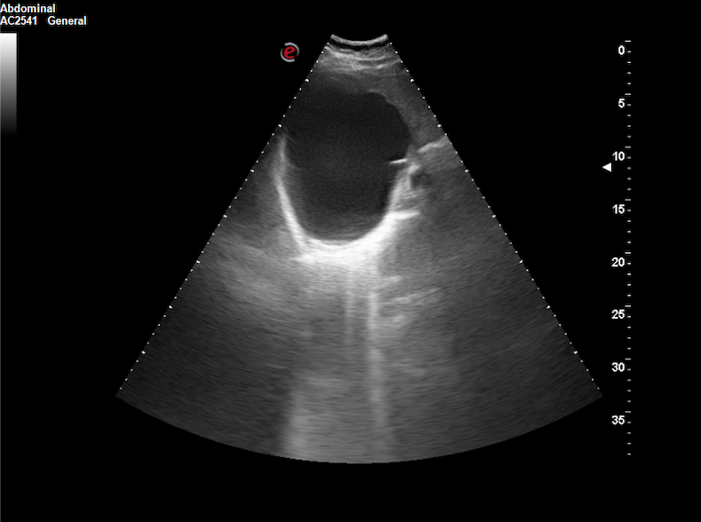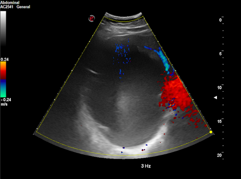 Realizamos ecografía clínica (EC) en nuestro centro de salud, objetivando un quiste de 15 x 12 x 12 cm a expensas de lóbulo hepático derecho, con paredes lisas, refuerzo posterior, contenido anecoico y Doppler-negativo.