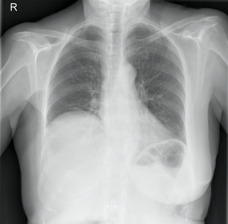 Mujer de 85 años, hipertensa en tratamiento con ARA-II, fue valorada por la mañana en su domicilio debido a dolor torácico no opresivo que aumentaba al inspirar de 24 horas de evolución. Acudió más tarde al punto de atención continuada (PAC) porque el dolor era intenso a pesar de la analgesia pautada. Indagando mejor, el dolor se localizaba en hipocondrio derecho irradiándose al hombro ipsilateral sin acompañarse de fiebre, ictericia, náuseas, vómitos ni alteraciones deposicionales. El ECG fue normal. La auscultación cardio-pulmonar anodina. Destacaba una hepatomegalia dolorosa de dos traveses de dedo con Murphy dudoso. Se derivó al Servicio de Urgencias Hospitalarias (SUH) para valoración. Los datos analíticos de laboratorio se encontraban dentro de límites normales. Se solicitó radiografía de tórax y abdomen que mostraron elevación de hemidiafragma derecho y se dió el alta hospitalaria con el diagnóstico de: «dolor abdominal inespecífico sin datos de alarma» con tratamiento sintomático.