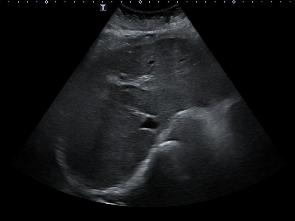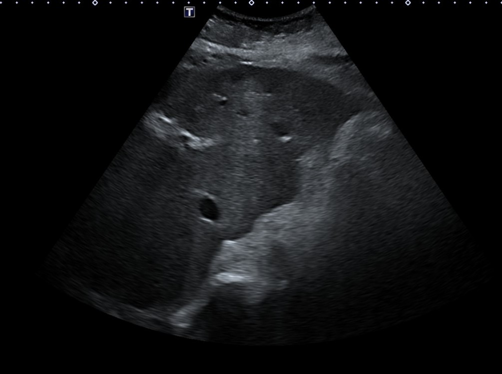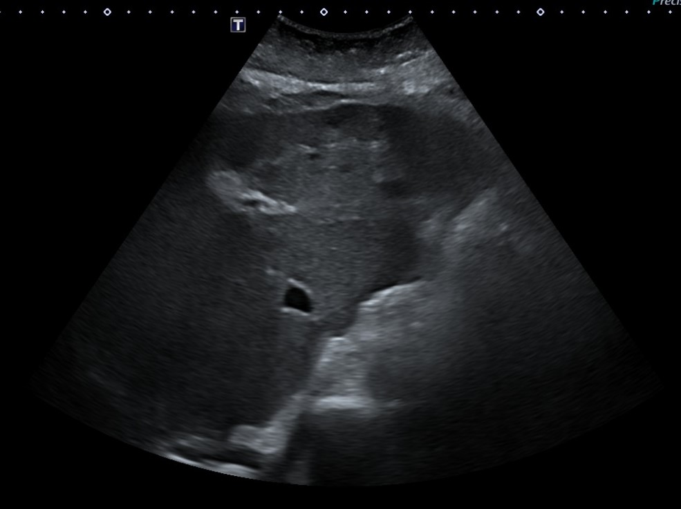Ante resultados analíticos se realiza ecografía clínica a pie de cama. Se evidencia parénquima hepático de consistencia irregular con lesiones hipoecoicas sugestivas de metástasis tumorales. Se solicita estudio reglado.