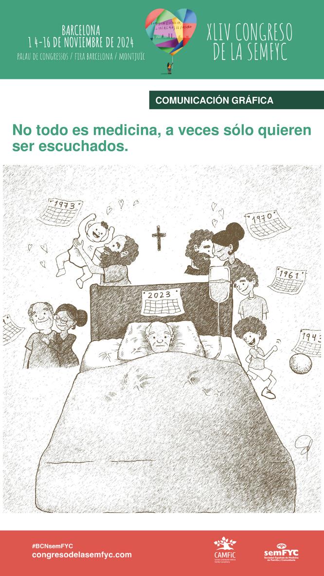 Ante el diagnóstico de una patología con un pronóstico fatal, el paciente muchas veces se siente desolado, es imprescindible saber acompañarlo y encontrar la forma correcta de transmitir la información. Esta comunicación gráfica fue inspirada en un paciente real, que estaba sobreviviendo a sus últimas etapas de cáncer terminal de colon. Él se encuentra recostado sobre su cama, en una casa rural, bastante alejada del hospital. Fuera de ella, hay pocas casas y un poco más allá, una infinidad de árboles. Llegar hasta allí es bastante difícil, pero es necesario. Como médicos, es nuestro deber que él reciba su medicina paliativa.