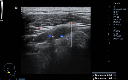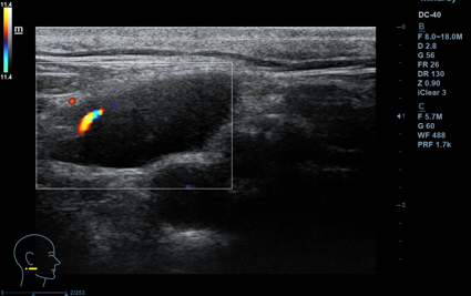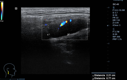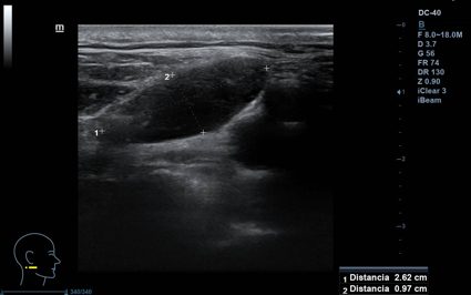 Lesión hipoecogénica cervical de aspecto sólido, de 2,5 x 1 cm (ancho x alto), con hilio vascular que preserva, impresiona de residual, vascularizado (Doppler). Otras lesiones similares de menor tamaño, pero con hilio mejor preservado, de aspecto benigno. Todas las lesiones impresionan de adenopatías. A nivel contralateral: lesiones similares en menor cuantía, también de aspecto benigno. Tiroides normal.