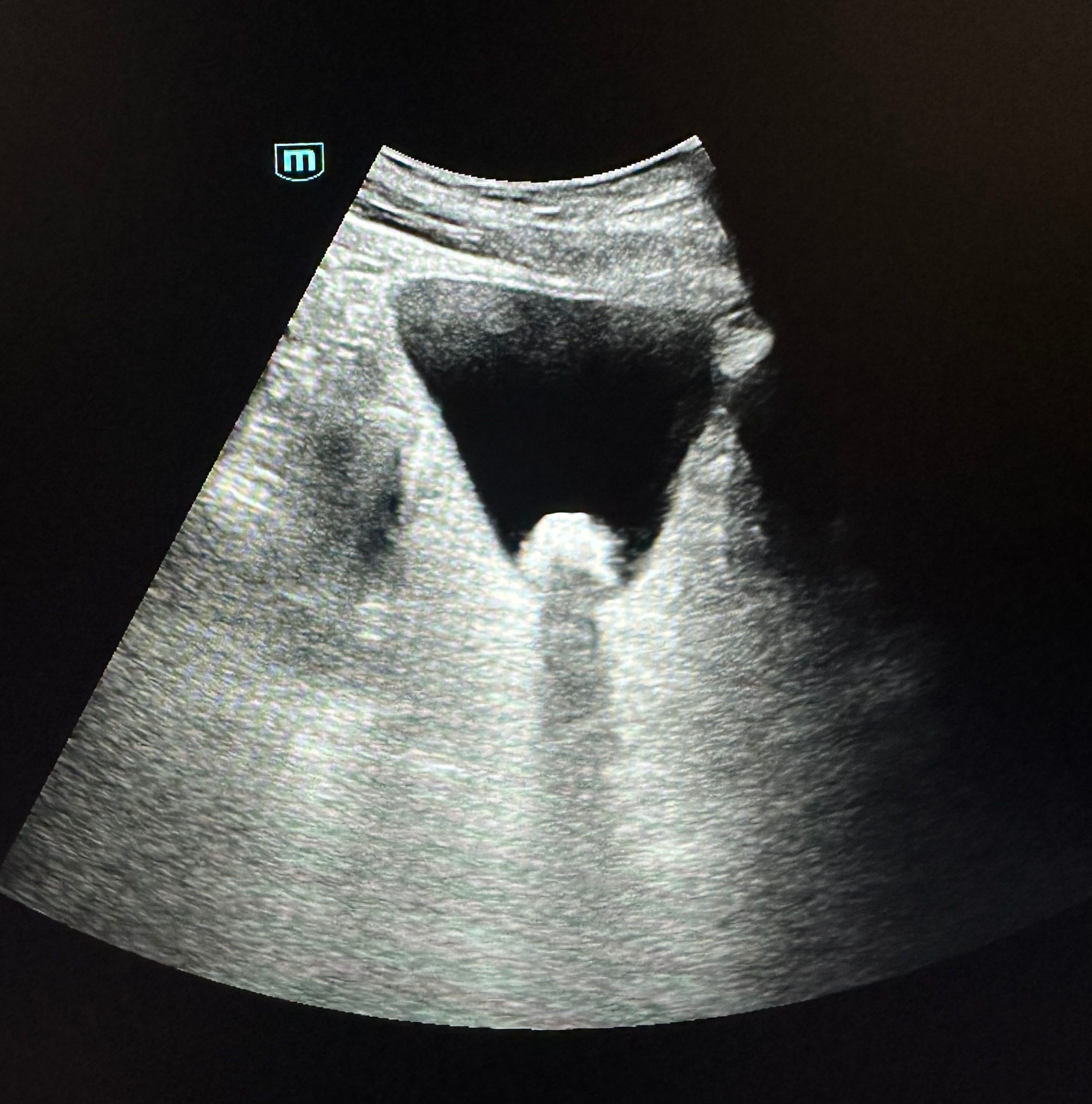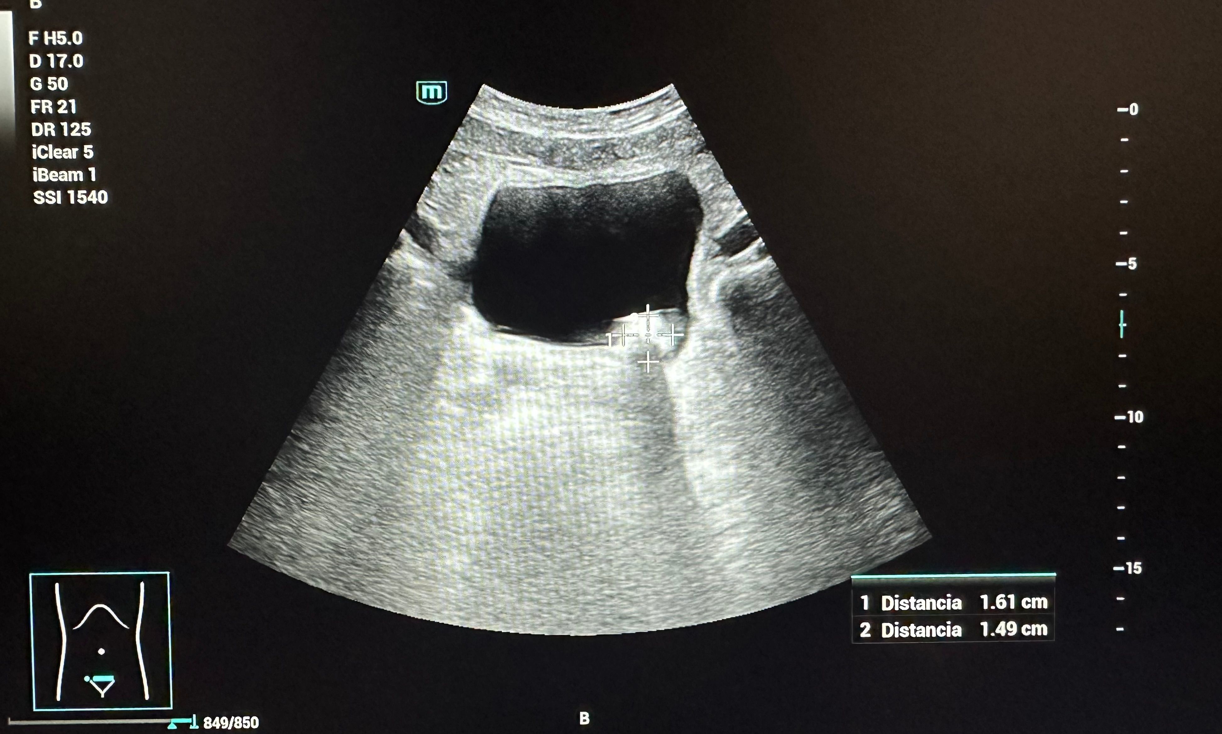 En la ecografía realizada se observó una litiasis vesical de 1,6 cm x 1,5 cm. No se observó dilatación de la vía urinaria ni otros hallazgos relevantes que sugirieran complicaciones agudas.
