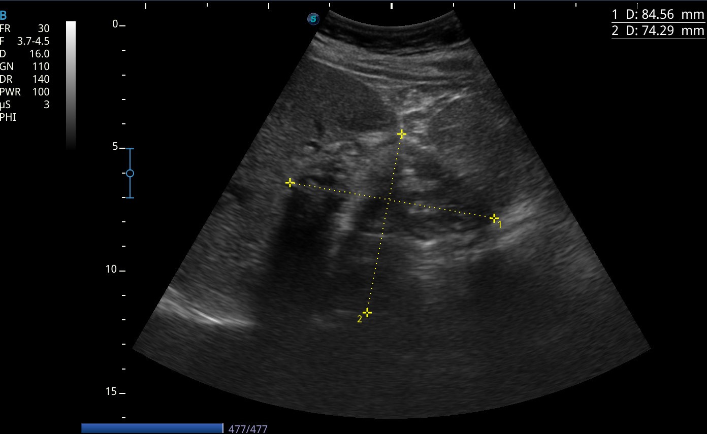 En la ecografía se observa una masa en lóbulo hepático derecho de paredes calcificadas y material heterogéneo hipoecogénico en su interior (8,1*7,6cm).