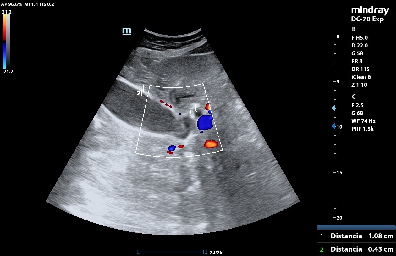 - POCUS: aumento tamaño de la vesícula biliar, eje longitudinal mayor de 11,19 cm, con pared vesicular engrosada de 0,43 cm y dilatación de la vía biliar. En su interior hay material ecogénico que no deja sombra posterior, compatible con barro biliar. No objetivo páncreas por interposición de gas intestinal. No presencia de líquido libre.