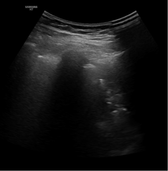 Ecografía clínica pulmonar: infiltrado en base izquierda con mínimo derrame y características de broncograma dinámico. Derrame pleural derecho de escasa cuantía con signo de la medusa.