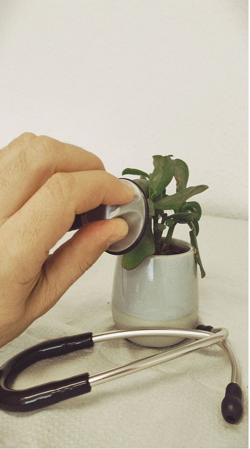 La foto, tomada en consulta, pone de manifiesto la relación entre nuestra práctica clínica —el fonendoscopio— (lo que pensamos, decimos, hacemos, prescribimos, indicamos, aconsejamos y acompañamos desde la consulta) y el medio que nos rodea —la planta—.