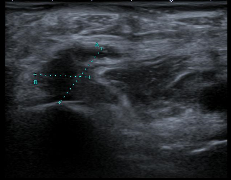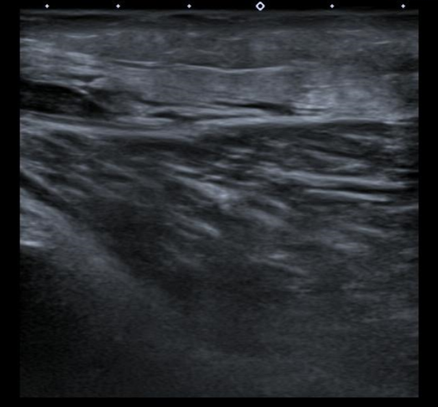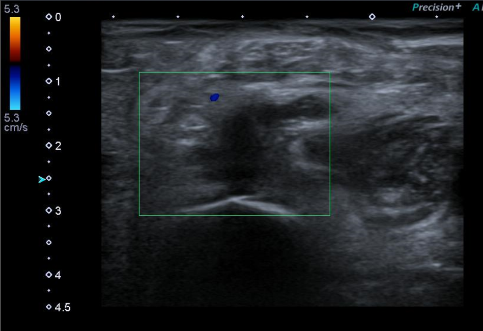 Ecografía Doppler miembros inferiores: venas permeable sin signos de TVP. En el hueco poplíteo de MID se observa una estructura anecoica de aproximadamente 17 x 14 mm (AP x T), con restos hiperecogénicos en su interior y cuyo polo inferior muestra una morfología irregular afilada, observándose láminas de líquido adyacentes. Hallazgos compatibles con rotura de quiste popliteo (de Baker).