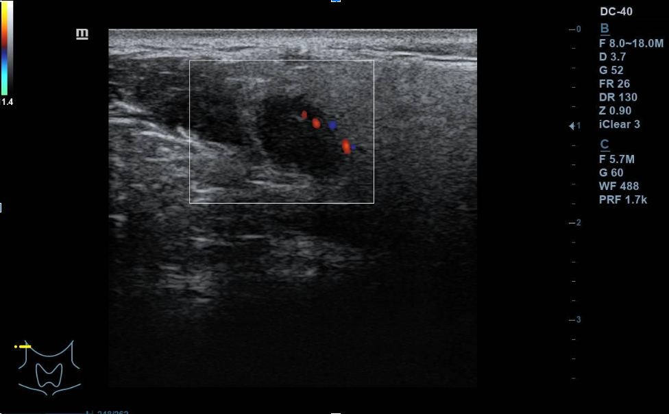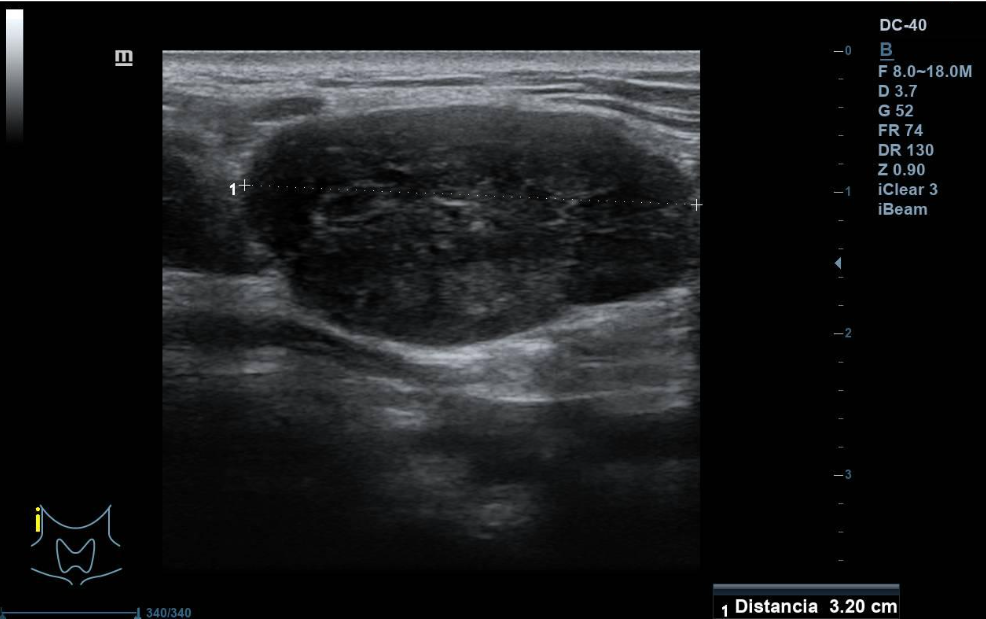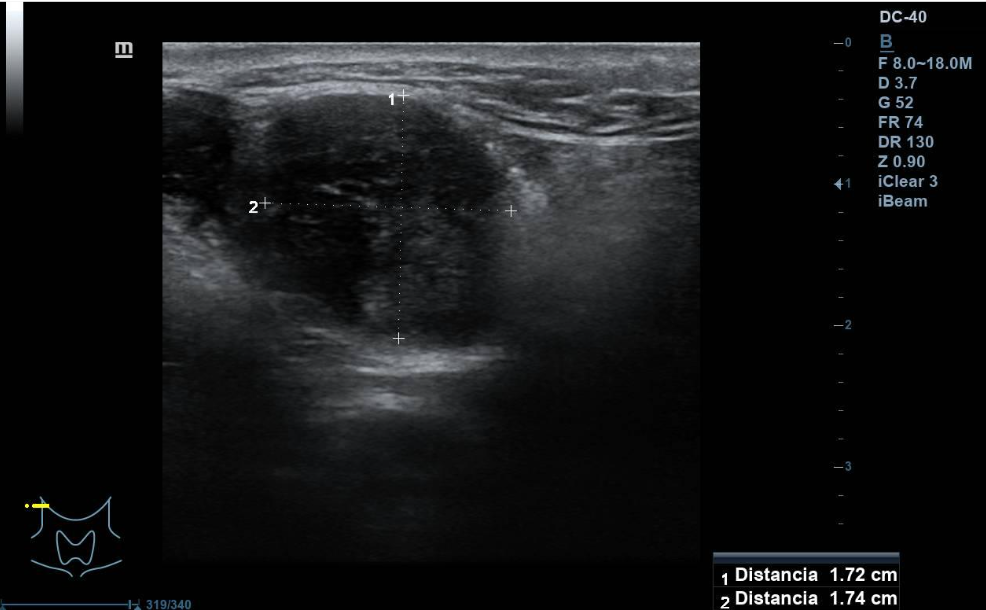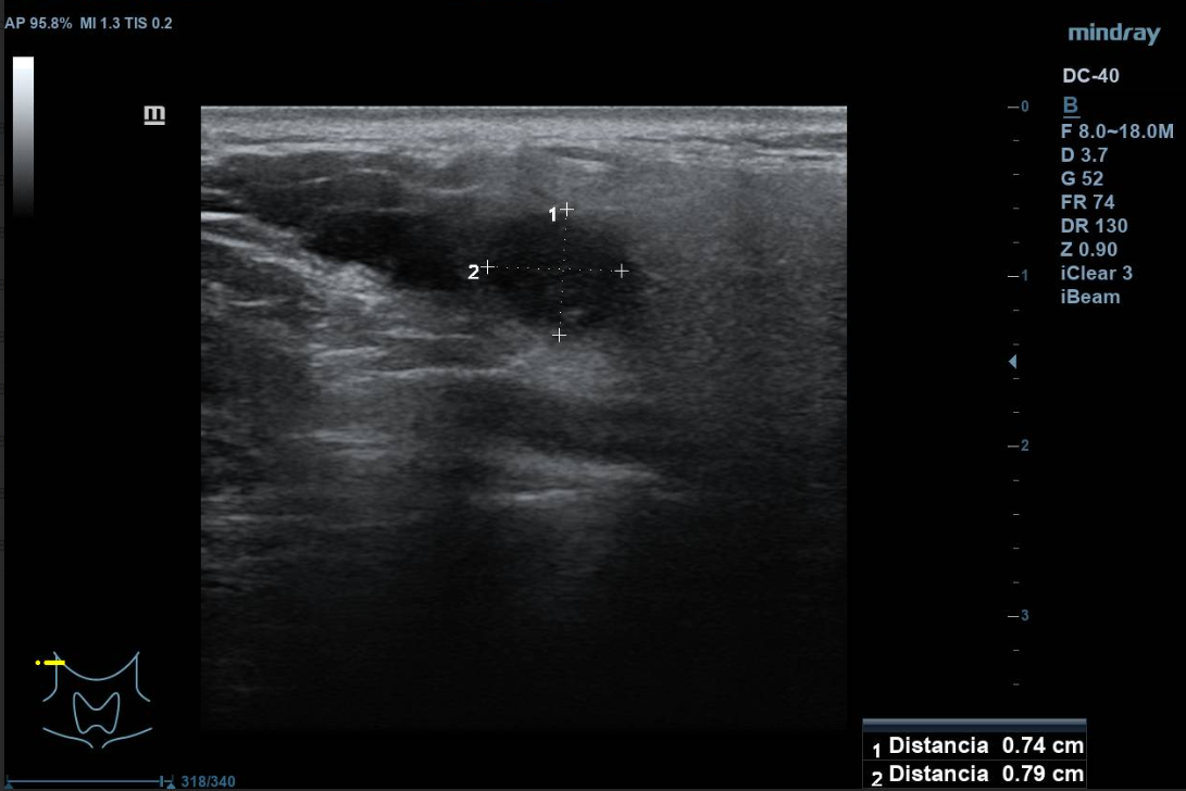 Se aprecian al menos dos lesiones intraparotídeas, una menor hipoecogénica, redondeada de unos 10 mm de diámetro máximo, doppler con vascularización mixta. La mayor de unos 3 cm de diámetro máximo, hipoecogénica, de contenido irregular, con áreas anecogénicas, de características sólidas, bien definido. Vascularización mixta, central y periférica. No se observan adenopatías cervicales de aspecto ecográfico patológico. La parótida contralateral, impresiona de normalidad.