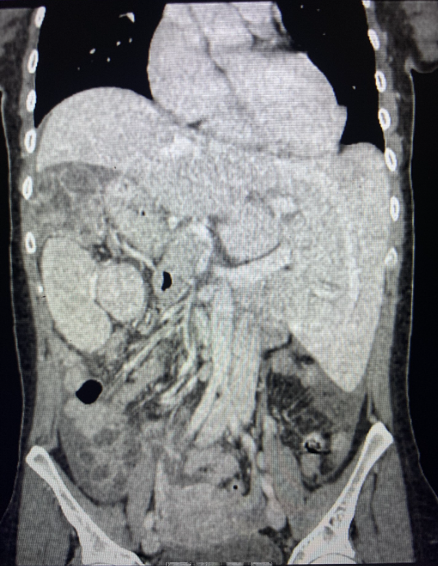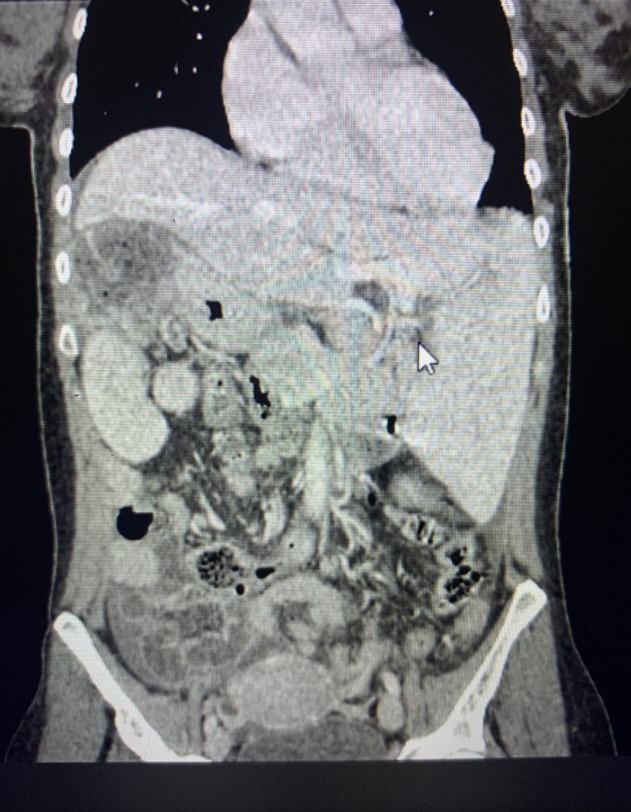 TAC Abdominal: Situs inverso de órganos intraabdominales. Imagen hipodensa de aspecto pseudocoleccionado subdiafragmático derecho de 89 x 63 mm, asociado a aumento de densidad y trabeculación de la grasa adyacente, que no consigue caracterizar por completo. Leve engrosamiento parietal hipodenso segmentario del colon izquierdo, asociado a aumento de densidad y trabeculación de la grasa adyacente, altamente sugestivo de colitis, de etiología indeterminada. Presencia de líquido libre en ambas gotieras y en pelvis.