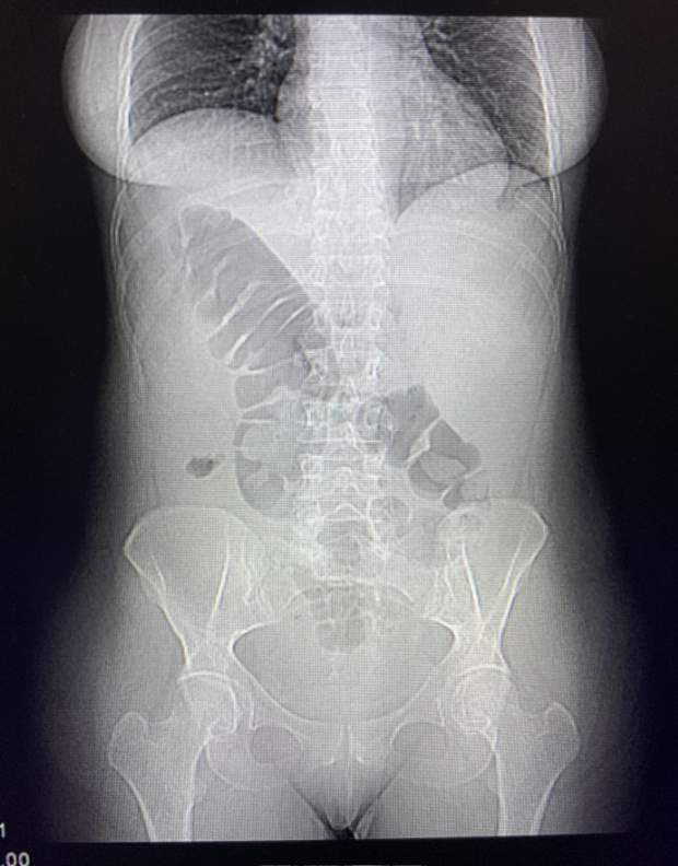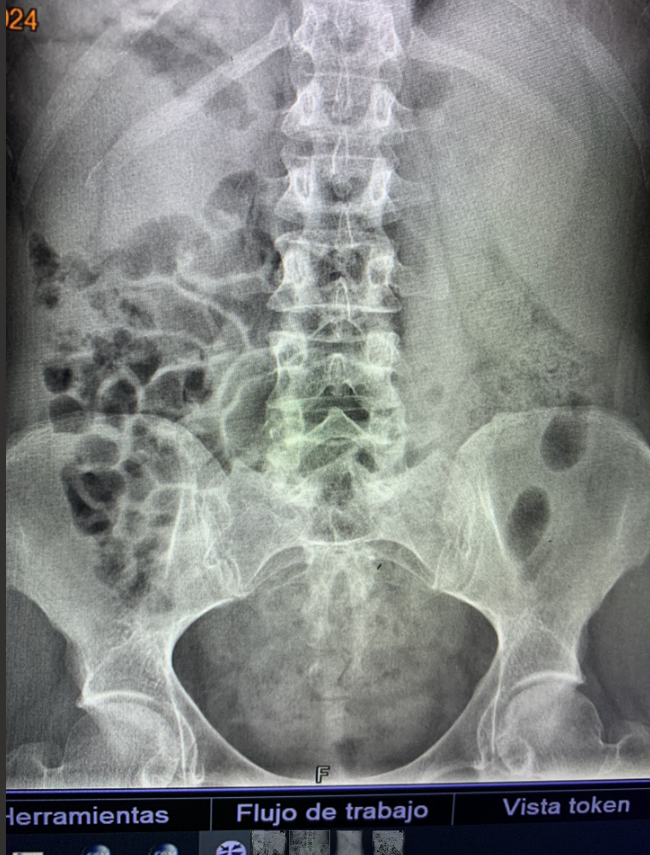 Radiografía Abdomen: Asas de delgado en marco colónico derecho. Gas en marco colónico izquierdo, Heces en ampolla rectal, sin niveles hidroaéreos (no describen anormalidades).