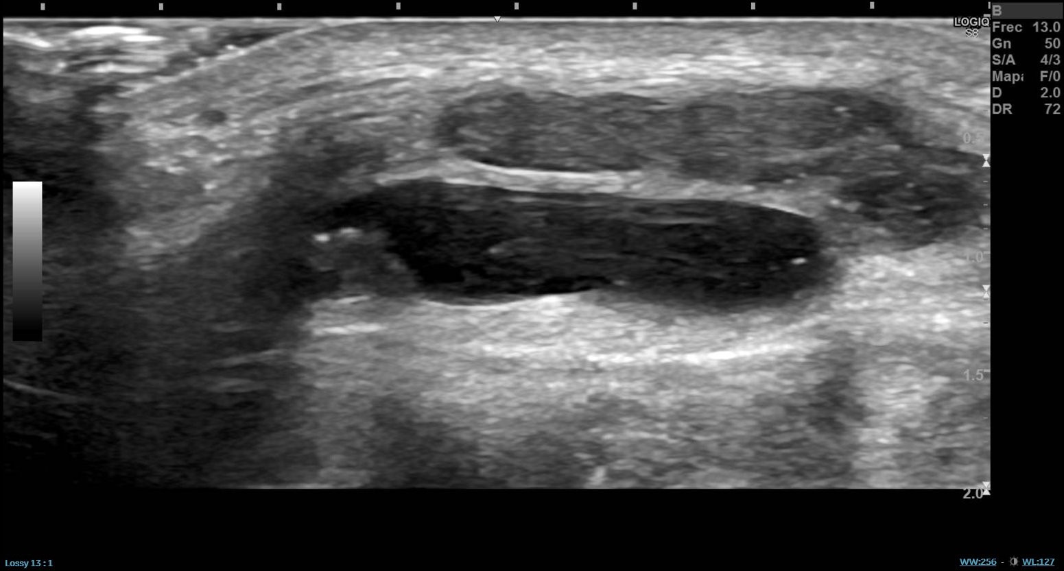 Ecografía con sonda lineal cara externa rodilla izquierda: lesión subcutánea quística poliglobulada, superior al margen más externo del compartimento femorotibial. No se ve pedículo hacia dicho especio articular ni hacia la articulación tibioperonea superior sin que se pueda descartar que no se trate de un ganglión. No hay datos de rotura del margen externo del menisco lateral sin poder descartar un quiste parameniscal.