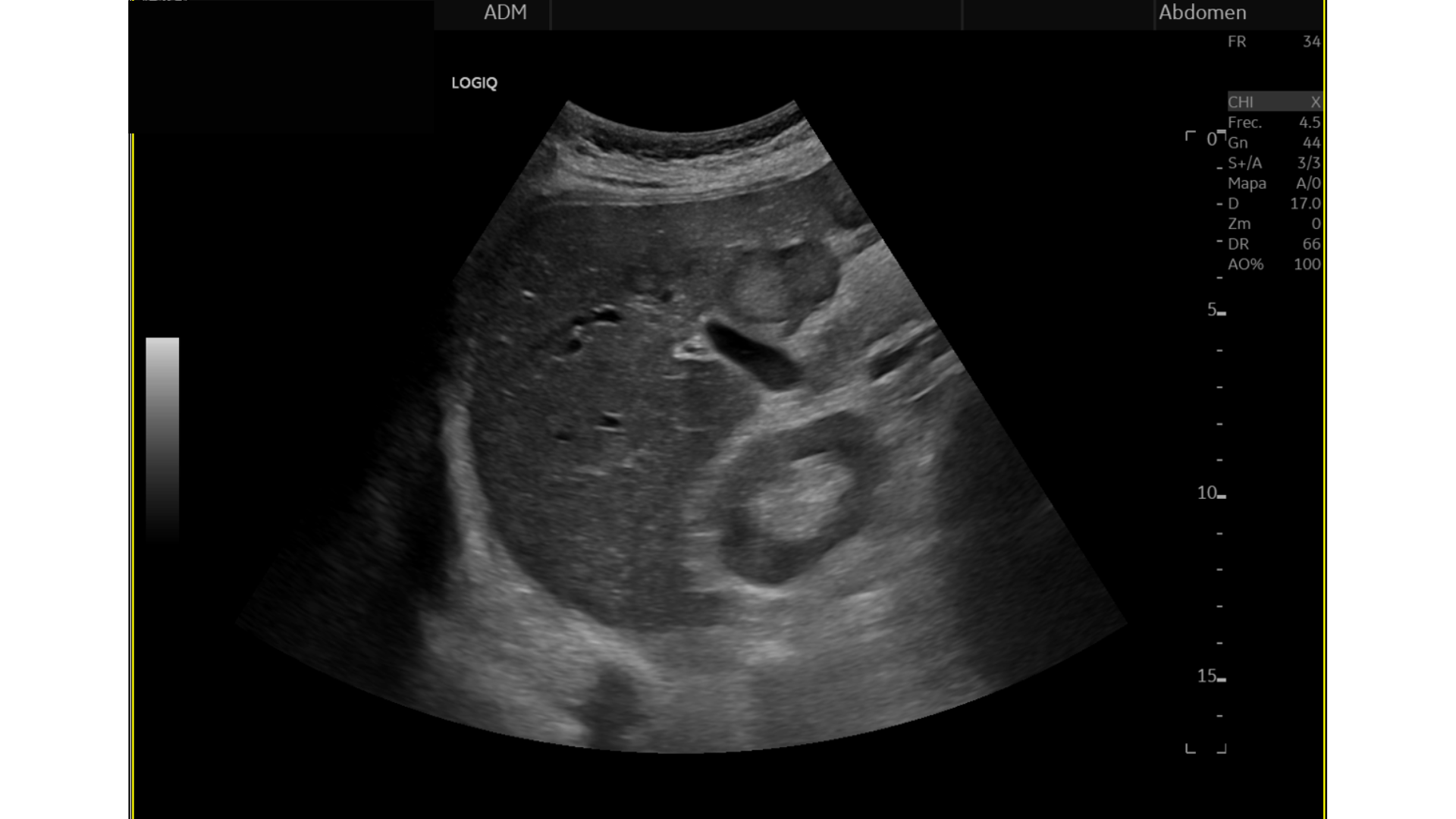 Eco Abdominal: Múltiples imágenes nodulares heterogéneas en ambos lóbulos hepáticos sugestivas de M1. Destaca imágen nodular, hipoecogénica en cabeza/cuerpo de páncreas de aprox. 17 mm, podría corresponderse con proceso neoformativo primario.