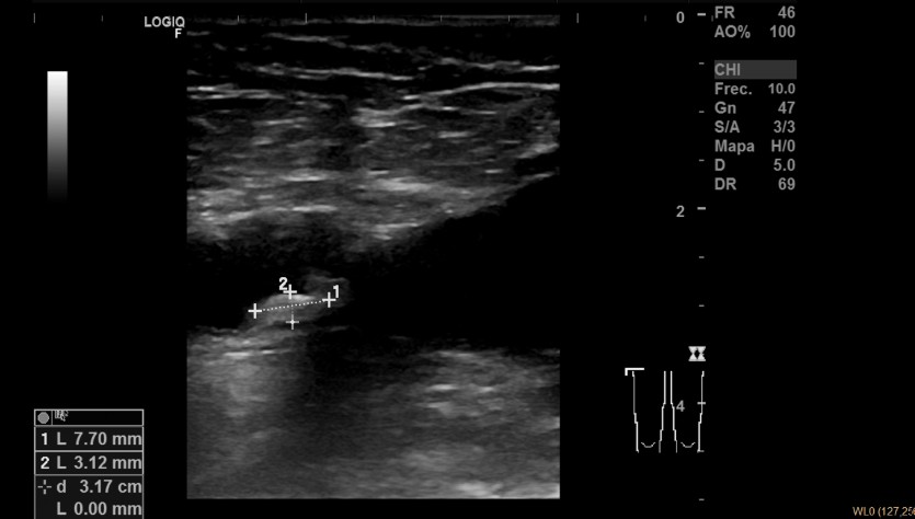 Descripción de los hallazgos ecográficos y las imágenes más relevantes para la resolución del caso: Ecografía multivaso: Placa translúcida de 1,97 x 8 mm en bulbo de carótida derecha, placa translúcida de 6,56 x 2,11 mm en carótida izquierda, placa hiperecogénica de 7,7 x 3,12 mm en femoral derecha. Aorta normal.