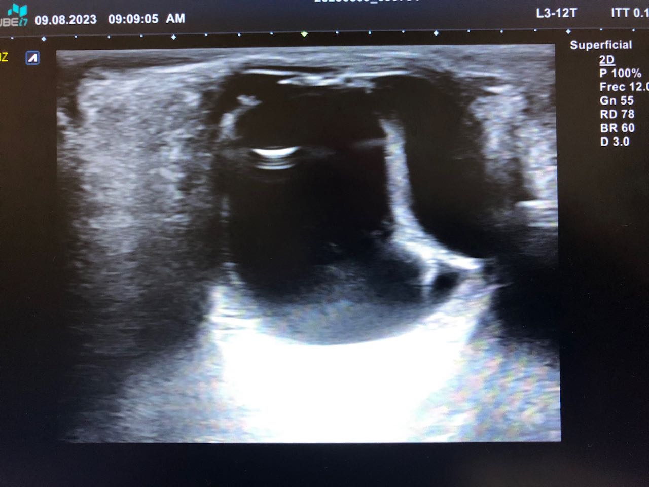 Citado en cita forzada, refiere molestias oculares, con sensibilidad a la luz, que le obliga a mantener el ojo cerrado, acude por precisar gotas para la conjuntivitis, ante la dificultad idiomática y considerar que el paciente es poco preciso en la descripción de los síntomas, pues ante la pregunta de «si tiene dificultades en la visión» el paciente se reitera que le molesta muy cierra el ojo, y en relación con el dolor que es como si tuviera algo que le roza. Se procede a la exploración ocular, observando un ojo derecho normal con blefaroespasmo en ojo izquierdo (OI), hiperemia ocular tarsal, con pupilas reactivas, fluortest negativo y presión intra ocular (medición palpebral), normal en los dos ojos. Ante la incongruencia de la sintomatología referida y los hallazgos exploratorios, se considera indicado hacer una ecografía ocular, en la que se apreció signos de desprendimiento de retina y coroides del OI.