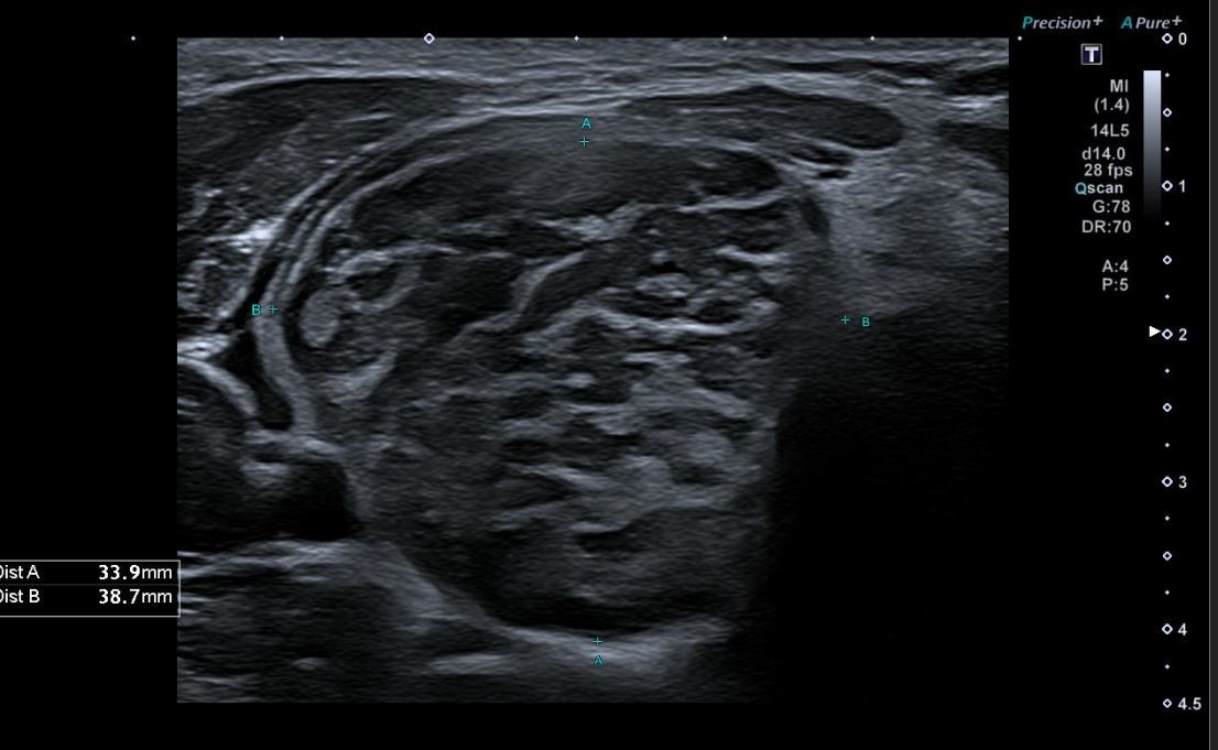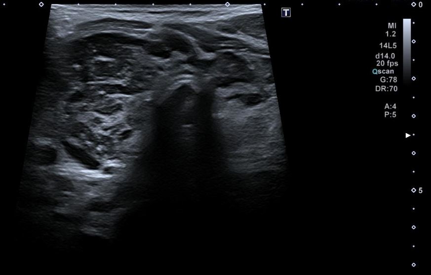 El juicio clínico es de una tiroiditis aguda, por lo que se deriva al paciente a urgencias hospitalarias. En urgencias se solicita una analítica sanguínea en la que destaca Leucocitos 7,34 x 103 y PCR 68 mg/L; y una ecografía reglada donde se informa de «tiroides aumentado de tamaño a expensas de lóbulo tiroideo derecho con alteración de la ecogenicidad del parénquima que sugiere proceso infiltrativo afectado al lóbulo derecho, istmo y región anterior del lóbulo izquierdo, no pudiendo apreciar etiología infiltrativa o tumoral».
