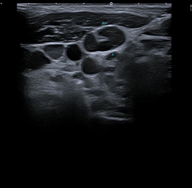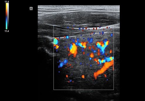 Una vez realizada la anamnesis y la exploración física, se decide realizar una ecografía clínica en la consulta, donde se objetiva un aumento difuso de tamaño del lóbulo tiroideo derecho (33,9 x 38,7 mm), levemente hipoecogénico, con áreas anecoicas en su interior y adenopatías asociadas. Se aplica Doppler color resultando positivo.