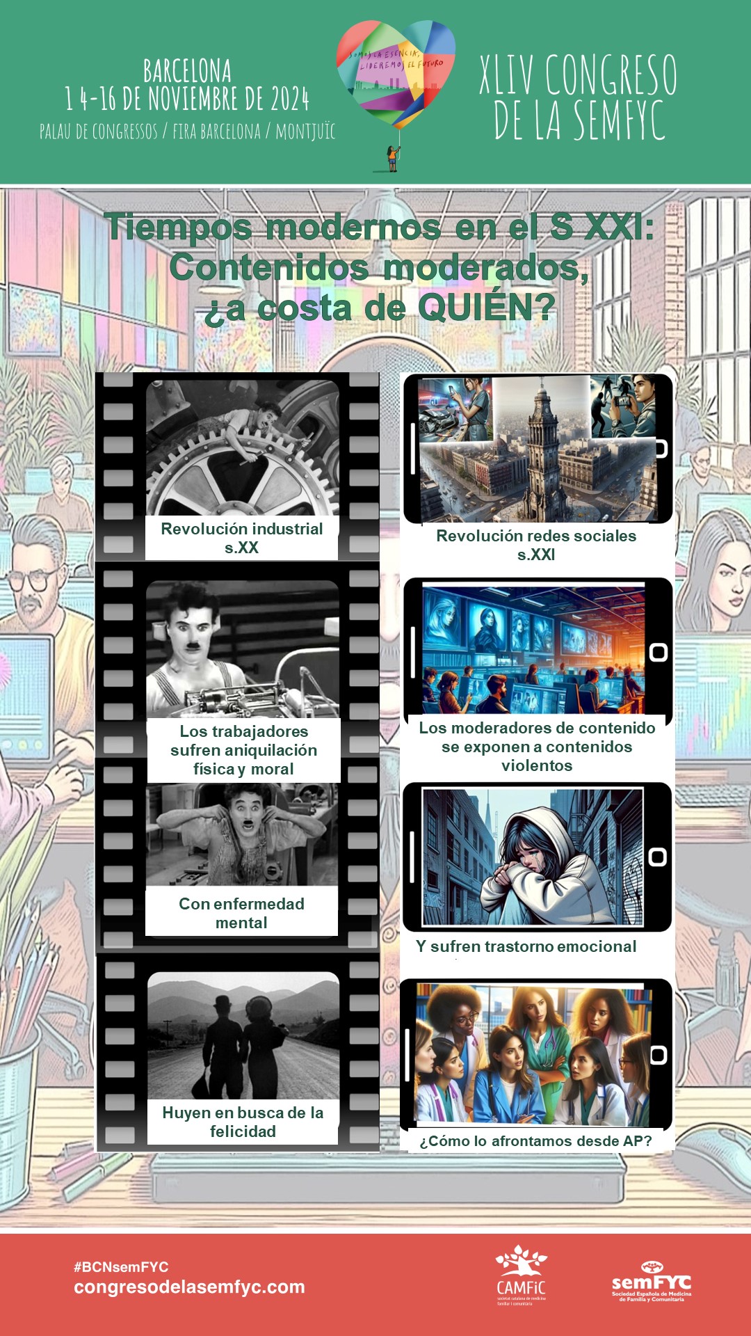 En la secuencia de imágenes de la derecha, se crea un paralelismo con los retos en salud mental de nuevos perfiles profesionales ligados a la actual revolución de las redes sociales. Los moderadores de contenido están expuestos de manera continua a la visualización de contenido violento, día tras día, como en una cinta sin fin. Esta exposición genera en ellos trastornos emocionales, poco descritos en la actualidad, que empezamos a identificar en las consultas de Atención Primaria como, insomnio, desmotivación, hiperalerta, tristeza, estrés. ¿Seremos capaces de dar una mejor respuesta a la que tuvieron Charles Chaplin y su amiga?