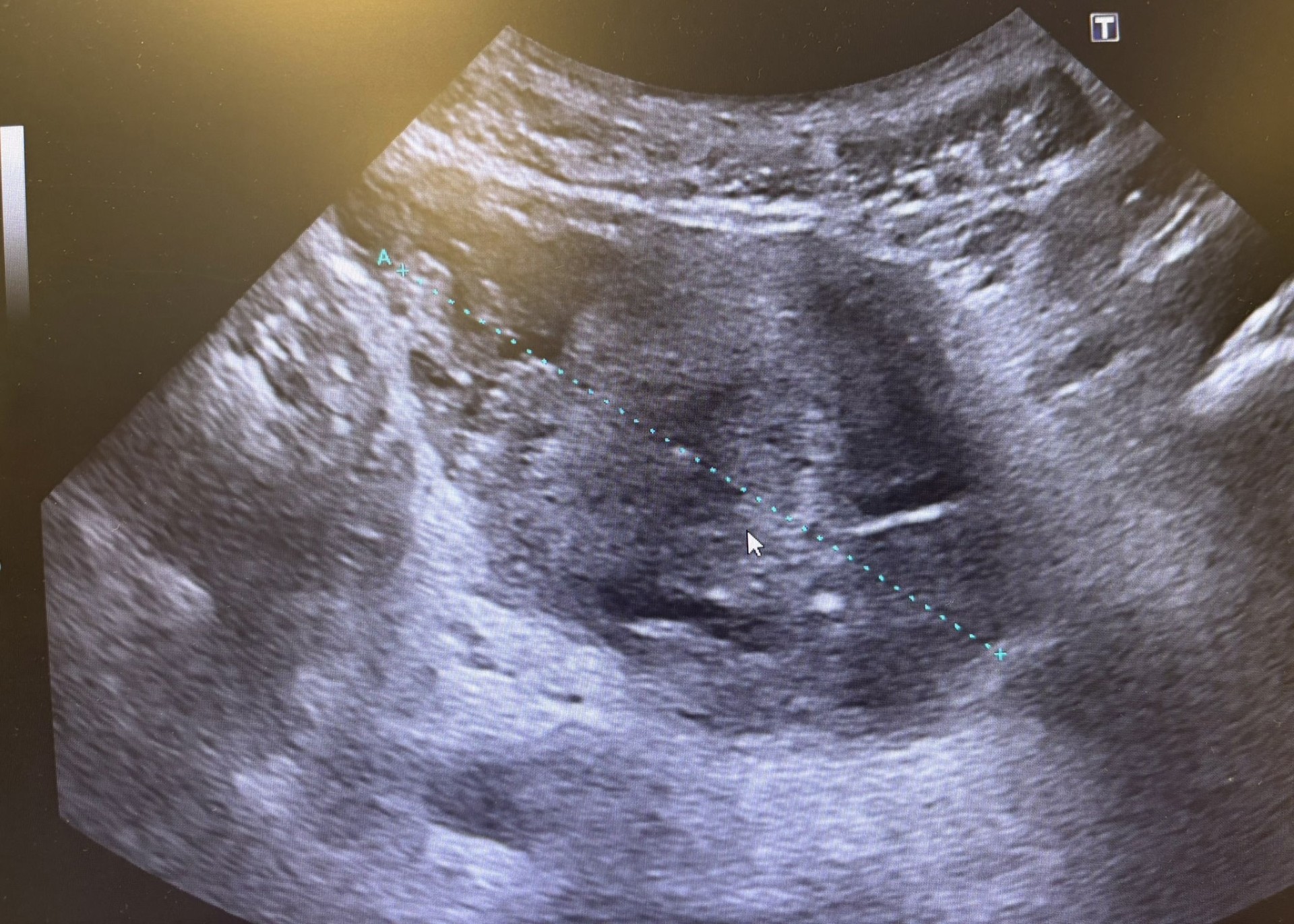 Principal sospecha: Neoplasia vesical infiltrante. Diagnósticos diferenciales: cistitis crónica, hiperplasia prostática con crecimiento intravesical, pólipo vesical.