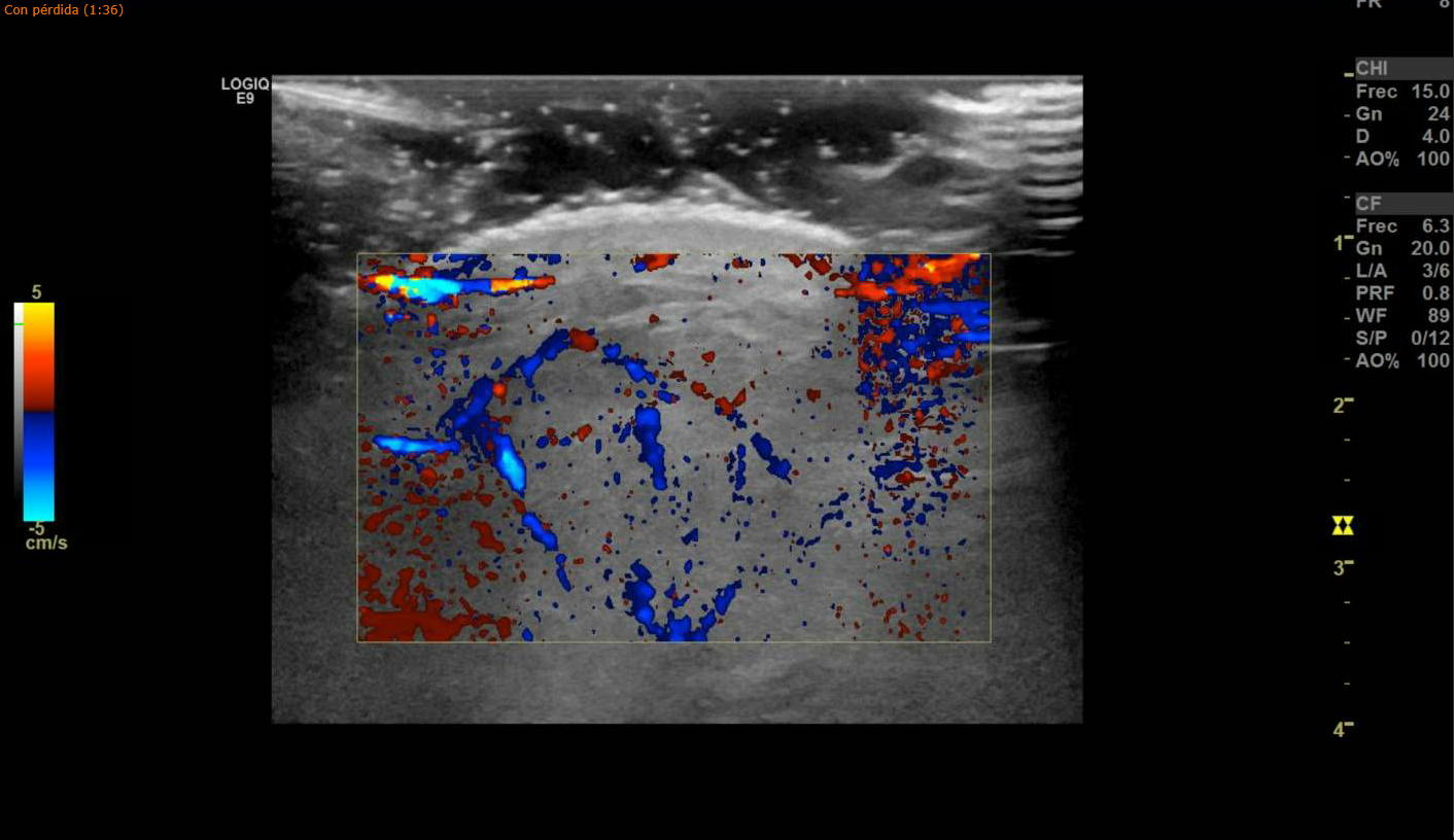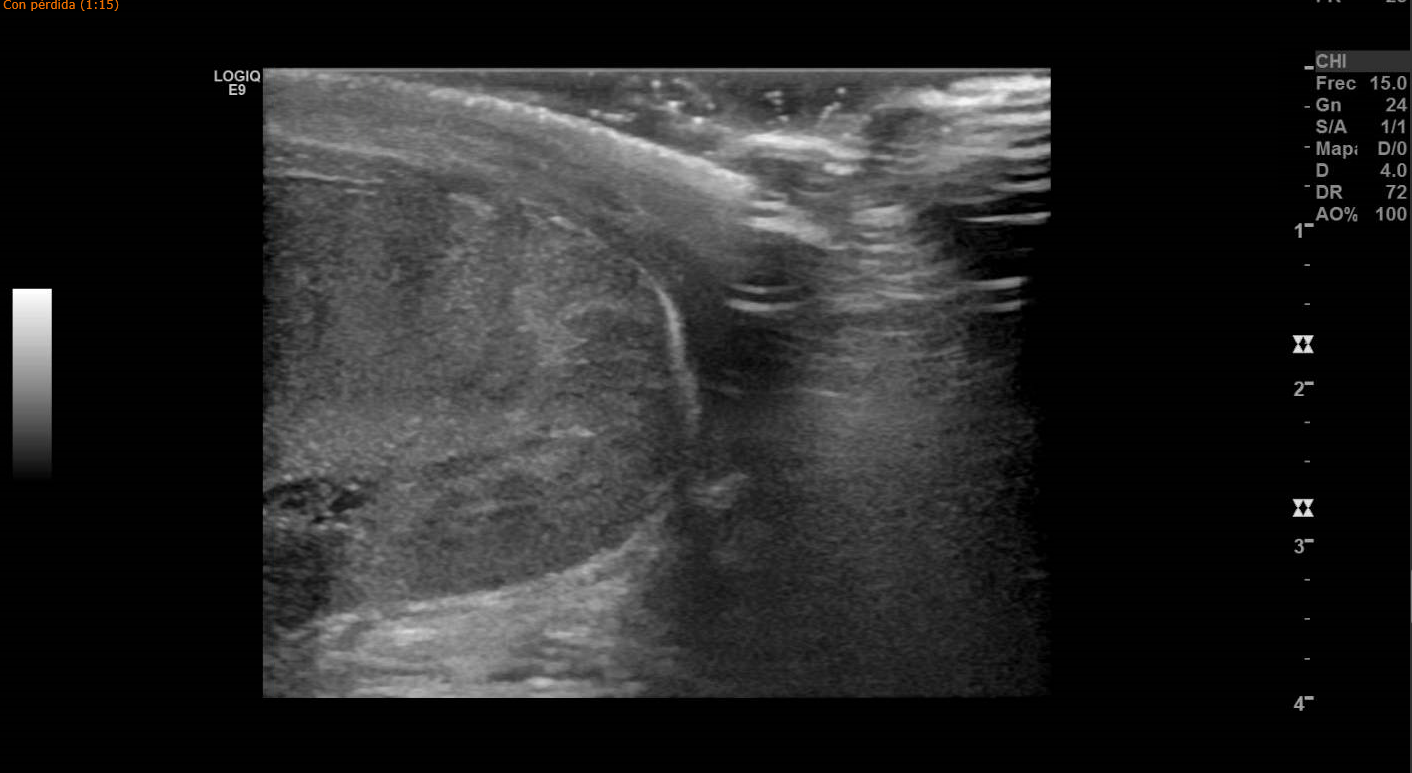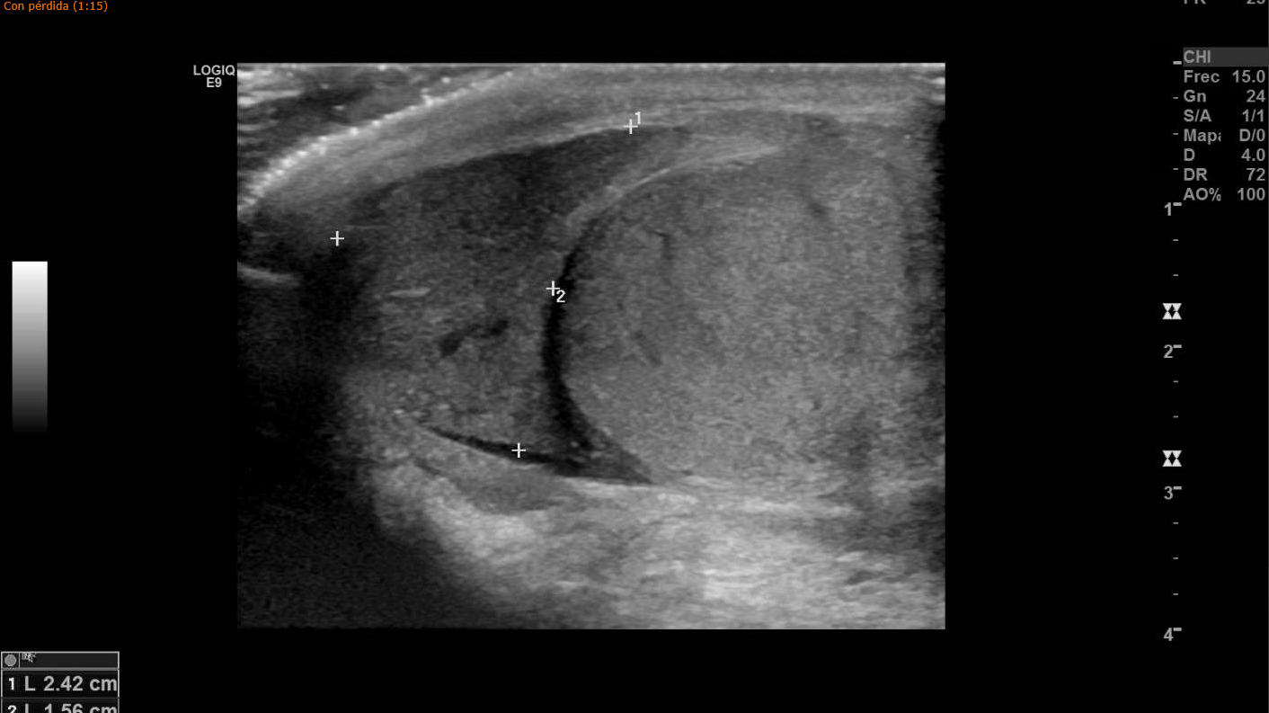 Para confirmar la sospecha se le realiza ecografía testicular, apreciando colección hemática en borde superior de bolsa escrotal izquierda, conservando flujo arterial y venoso. Impresiona de línea hipoecogénica que atraviesa el parénquima testicular, correspondiendo con rotura traumática de testículo izquierdo.